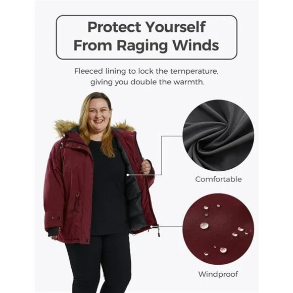 Big is Beautiful - This plus size winter coat for women is made available in different modern and stunning colors. Choose from size 1X to 5X to ensure a custom, comfy, and figure-flattering fit, and show off your classic taste in clothing by sporting this zip-up winter ski jacket.100% Recycled Waterproof Fabric- Our women’s plus size winter coats are made with recycled polyester, which requires far fewer resources than new fibers and generates fewer CO2 emissions. The shell fabric with a 5,000mm waterproof rating effectively keeps out light rain. Stay protected no matter where your adventures take you with our women’s ski jacket.Stay Warm on The Slopes - Thick durable and high-quality fiber gives these fleece-lined plus size winter coats for women impressive thermal insulation. The durable shell lets you move freely. Enjoy a snug snow jacket for women no matter where you go.Advanced Waterproof Properties - Made with high-tech 3,000 mm waterproof fabric, these plus size ski jackets for women keep you dry all day. Its secure seals withstand water, rain, fog, storms, and snow. Stay clean and confident with this waterproof jacket in rainy and snowy winters.