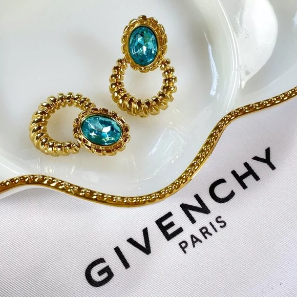 Authentic Givenchy Couture Topaz Doorknocker Clip-Ons crafted from Blue Topaz stones set in gold-toned hardware in the doorknocker style. They have clip-on backings and have the logo engraved on the backs of the clip and on the earring itself. They are in amazing vintage condition except for minimal tarnishing on the backs of the clip-on part. Please observe all photos. Measurements:Length: 2” Width: 1.5”•Reasonable Offers Welcome