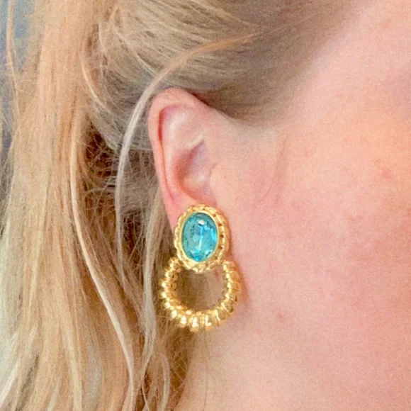 Authentic Givenchy Couture Topaz Doorknocker Clip-Ons crafted from Blue Topaz stones set in gold-toned hardware in the doorknocker style. They have clip-on backings and have the...