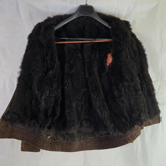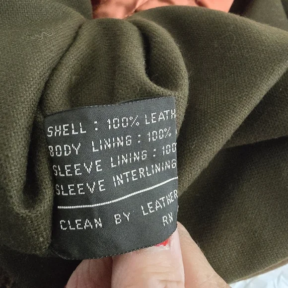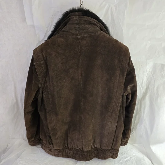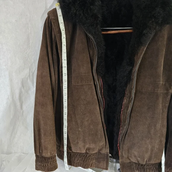 Designer Andrew Marc created this outstanding leather brown bomber jacket which will keep you warm in any cold weather.My floridian Mom brought thisfor a trip up north so it has very little wear.The bottom and arm sleeves both have ruches and elastic,2 side pocket and one lapel pocket.It comes with a zip out faux fur vest liner that can be worn without the jacket.Vest is lined in great amber cloth.Wear them separately or together, great leather bomber jacket with little wear.