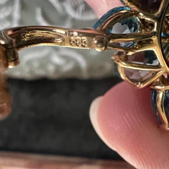 ***Please be sure to inspect pictures and descriptions carefully as I do not acceptStunning Blue Topaz cluster necklaces with Diamonds. 14K KN 585 Stamped. 1.5 inches by 1 inch.Vintage blue cord included 16 inches long.The back on the bail clips in and out to accommodate larger chains.See photo of the bail opened. Will come in a gift box, polishing cloth and care instructions.