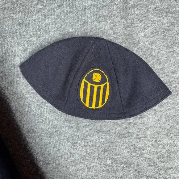 Good overall condition. Two small holes on lining and a couple of other marks shown in photos. Purchased at an estate sale. It came with the Maltese Cross beanie cap.