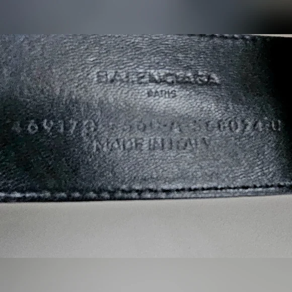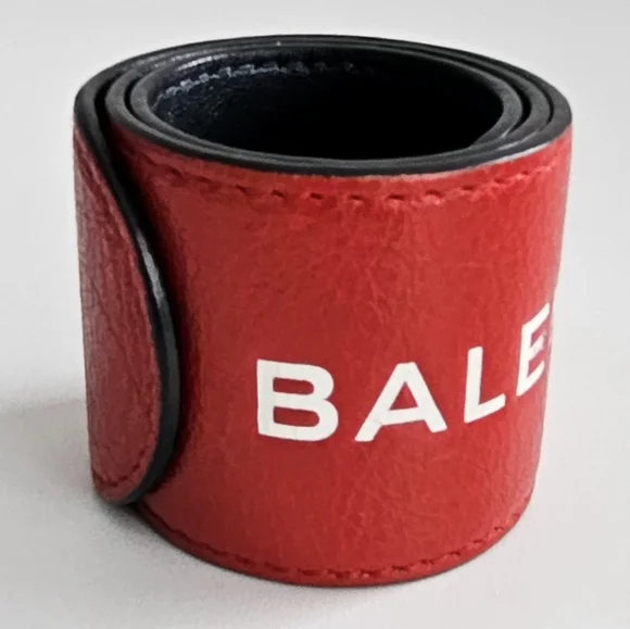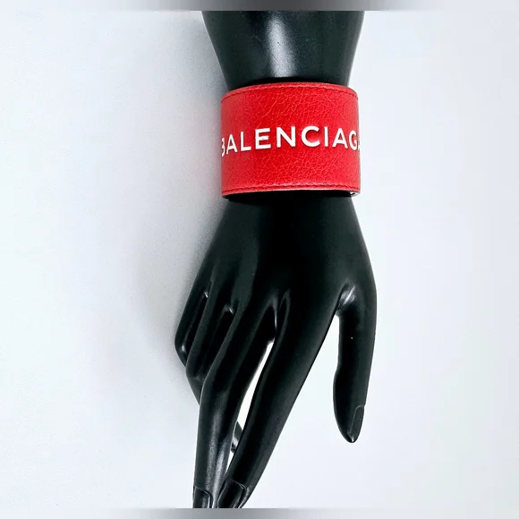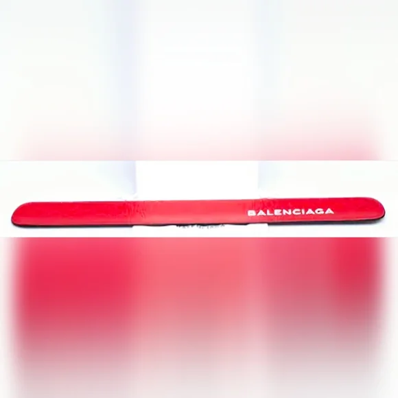 Authentic pre-owned red Balenciaga slap bracelet in solid calfskin leather with black leather underside and white "BALENCIAGA" printed across. Clean and beautiful, in excellent condition. Includes dustbag. - 15.5"L x 1.75"W