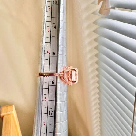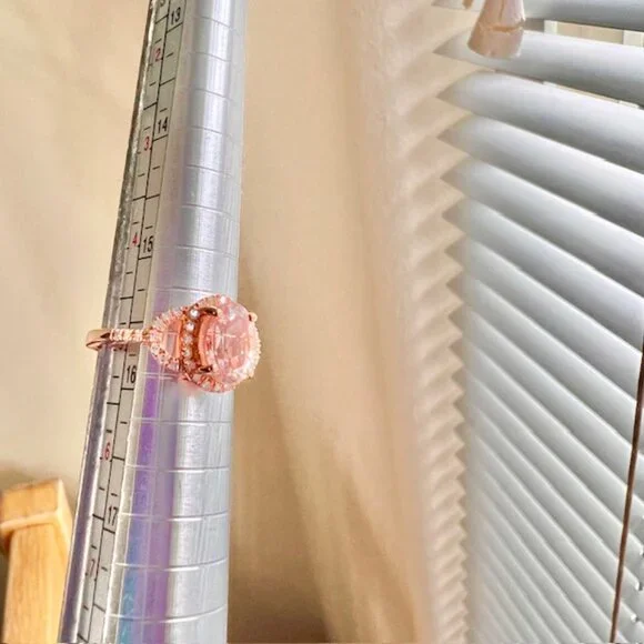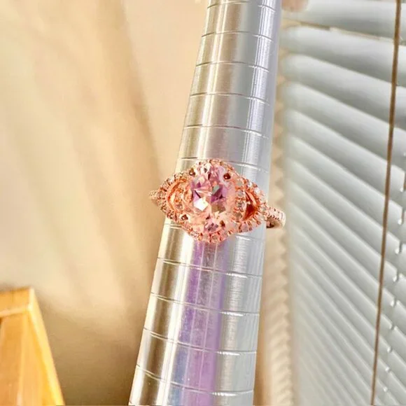 Beautiful private estate ring in excellent condition----. .85 carat morganite center stone.Stone is clear- see through----.25ct ctw diamonds. ---- Size 5----18K rose gold plated over .925 sterling silver.Stamped CHINA .925 on the inside of the band. ----Comes in a box.