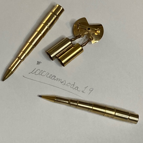 Amazing piece of roaring 1900’s history this is a vintage sweater pin with telescoping ink pen and lead pencil that are collapsible. The writing utensils are held in a canister container that becomes its body and cap. Super 1940’s patent pending Stretch pen with usable lead! The ink pen has its tube but it needs to be filled. Really this is an brilliant office assistant antique travel pen that is now the perfect fashion statement piece brooch that no one else will have. Open 3.5” long and .45” wide Closed 1.65” long .45” . Very rare! C-04