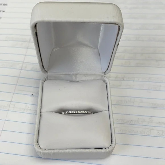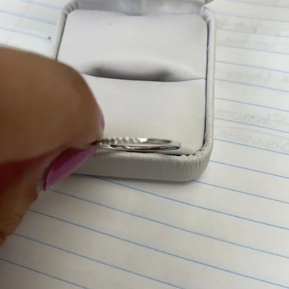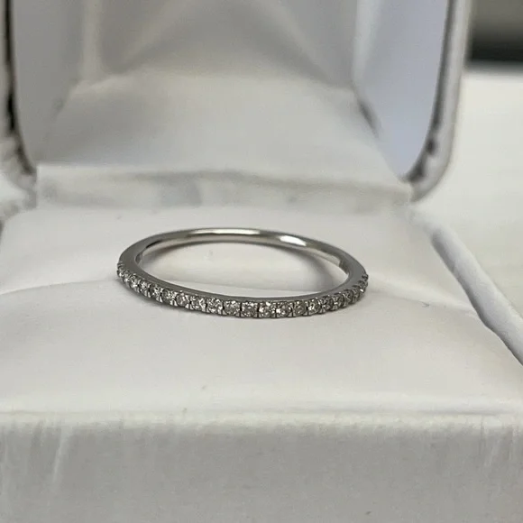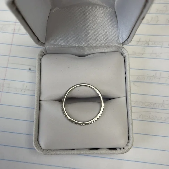 Brand New! Never worn!!!Size 7.Can be resized, if need be. Just picked up from the jewelers today. This band ring was part of a three ring stack set that also had a yellow gold band and a rose gold band. Not interested in keeping this white gold one. I wear much more yellow gold and rose gold these days.