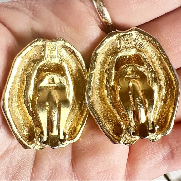 Authentic Saint Laurent “YSL” Vintage Gold Large Clip-On Earrings crafted from gold toned hardware with “YSL” engraved on the back of the clip-ons and “made in France” behind the clips. These are in pristine vintage condition and very rare. They are quite larger than a quarter. Please observe all photos. •Offers Encouraged•Will Trade with Experienced Traders