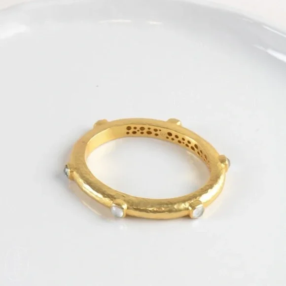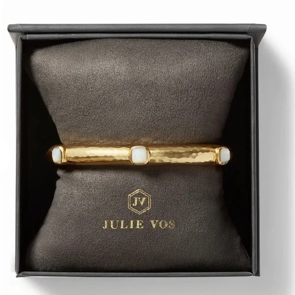 New with tags. Lightly hammered bangle showcasing six stations of rose-cut imported glass with iridescent clear crystal stones.Comes with Julie Vos dust bag and care card.24K gold plate, imported glass, iridescent clear crystal • 2.5 inch diameter• 0.325 inch width• Julie Vos hallmarkNew with tagsGift box not included