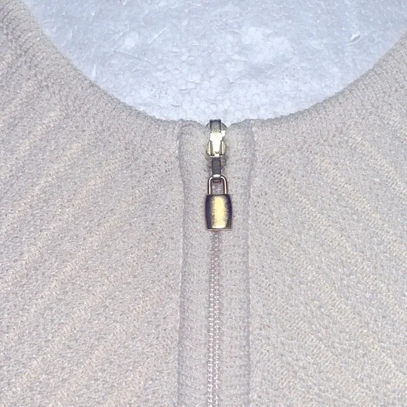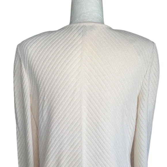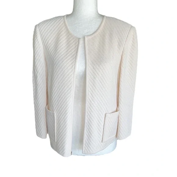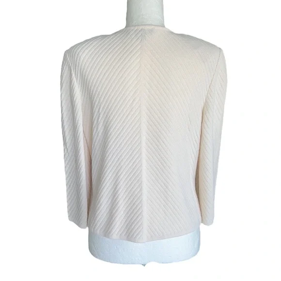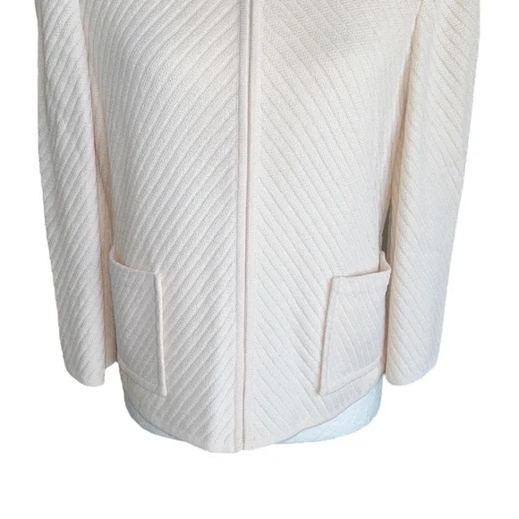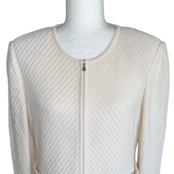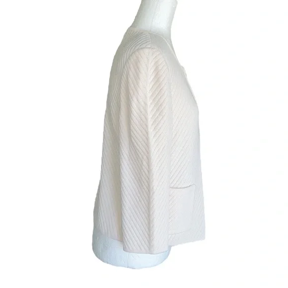 Beautiful St. John Ecru Cream Zip Front 3/4 Sleeve Cropped Knit Blazer Cardigan Ivory ecru off white cream textured knit in a diagonal striped patternZipper on the front with a...