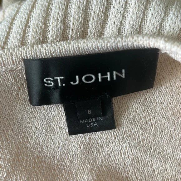Beautiful St. John Ecru Cream Zip Front 3/4 Sleeve Cropped Knit Blazer Cardigan Ivory ecru off white cream textured knit in a diagonal striped patternZipper on the front with a gold toned zipper pull in the shape of a lock3/4 sleeves Patch pocket on bottom front sides Cropped lengthcollarlessStretchy In excellent gently worn condition Size 8Bust pit to pit zipped up - 19”Length - 21”