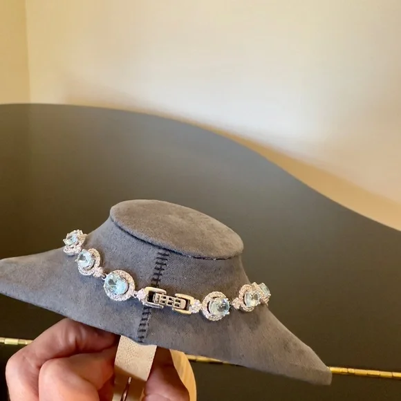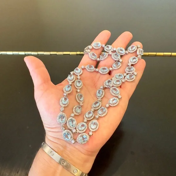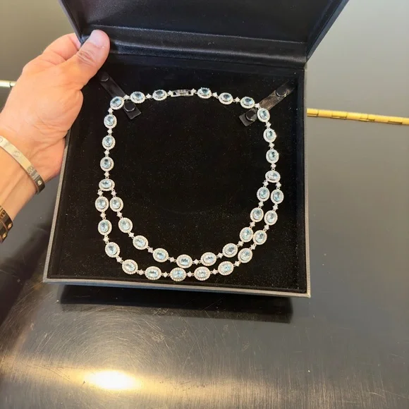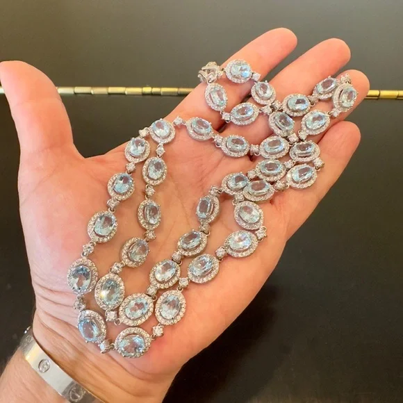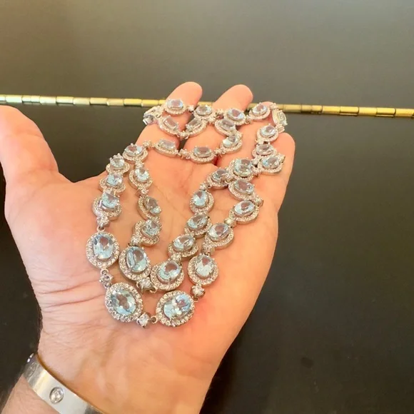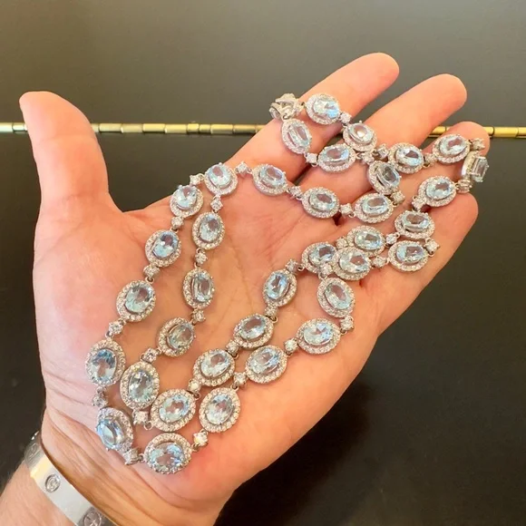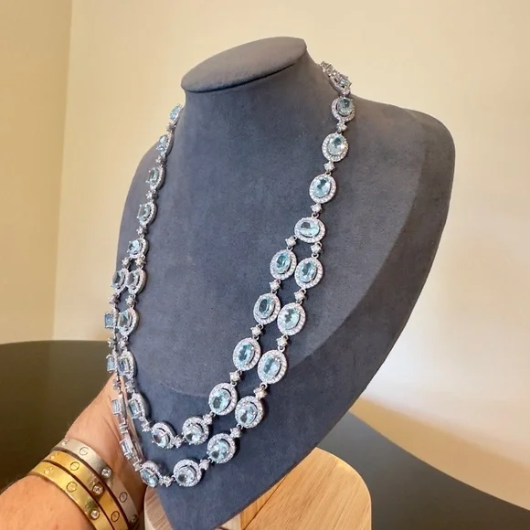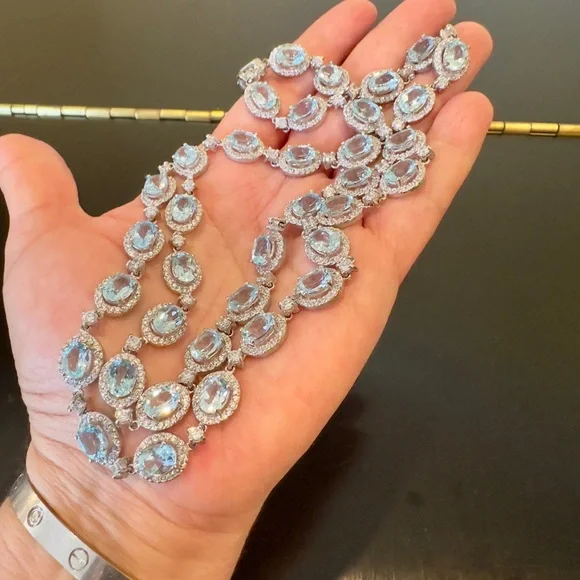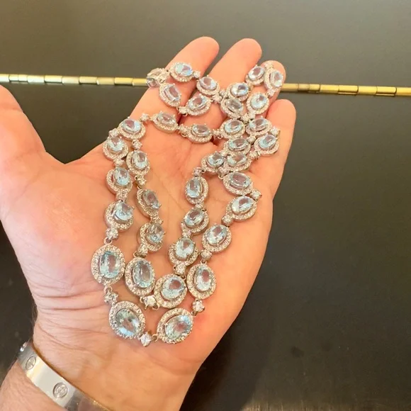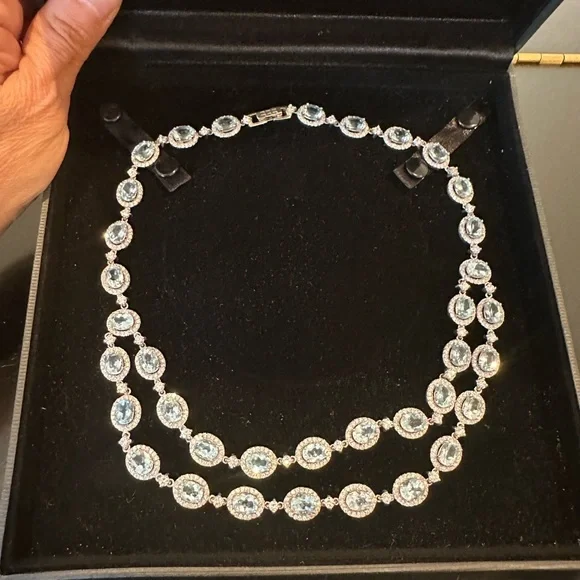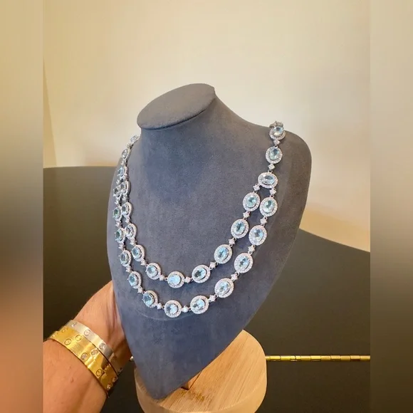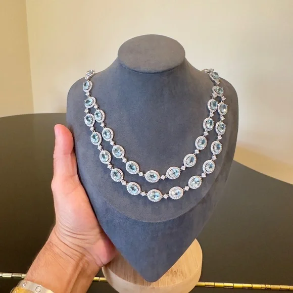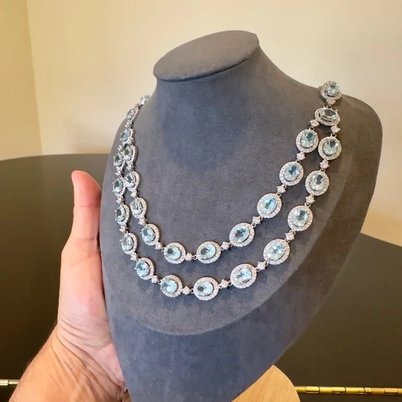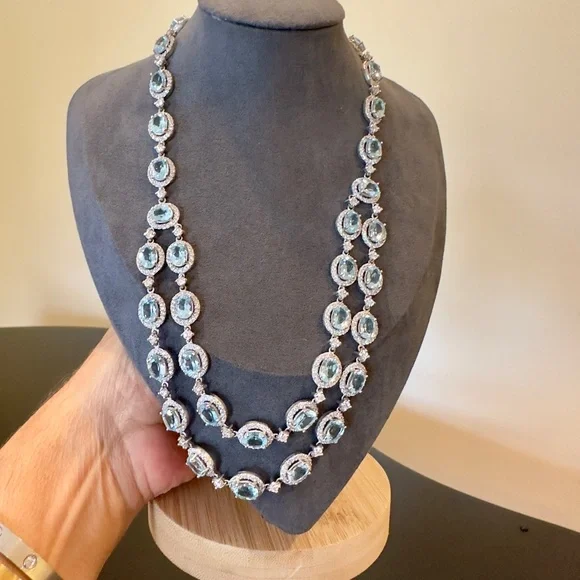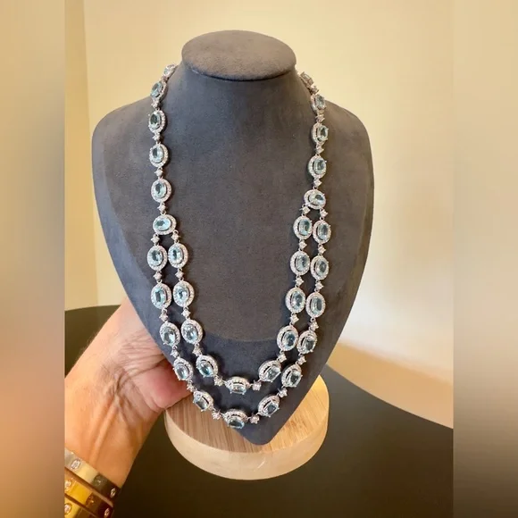 Luxury Maximalist Wedding Party RARE Vintage Royal Aquamarine CZ Necklace-Twinkling pavé CZs frame 36 faceted shimmering oval aquamarine gemstones, becomes two layers in the front, beautiful, handcrafted, has a royal vintage look, lays beautifully on neckline, my pics didn’t do it justice-purchased from my jeweler, he told me the necklace is aquamarine and CZ, I have a diamond and semiprecious stone tester, the large blue stones tested as semiprecious & white stones not diamonds-about 18” L measuring at the first layer (not including second layer), each aquamarine & CZ station is about .5” W-fold over clasp closure, 925 stamped on it, hard to read, slight tarnishing inside clasp where lock closes-rhodium plated sterling silver-look at pics & video as help describe item-will include more than one nice gift w/purchase, check out my reviews-SOLD OUT ONLINE & IN STORES, RARE-other listings:Givenchy, David Yurman, Ferragamo, Majorica, , , Zara, J. Crew, Vineyard Vines, Theory,Kendra Scott, Anthropologie, Kate Spade, Michael Kors,Ralph Lauren,Zac Posen,Ray-Ban, Cartier, Tory Burch, Burberry, Alexander McQueen, Julie Vos,Ted Baker, Free People, Tiffany & Co., Louis Vuitton, Marc Jacobs, BCBGMAXAZRIA, St. John, ESCADA, , UGG, Juicy Couture, Maaji, Steve Madden, Tahari, Kenneth Jay Lane, Alice + Olivia, Alexis Bittar, Judith Ripka