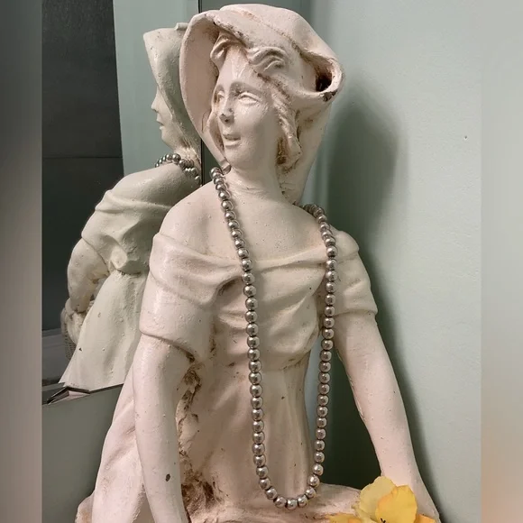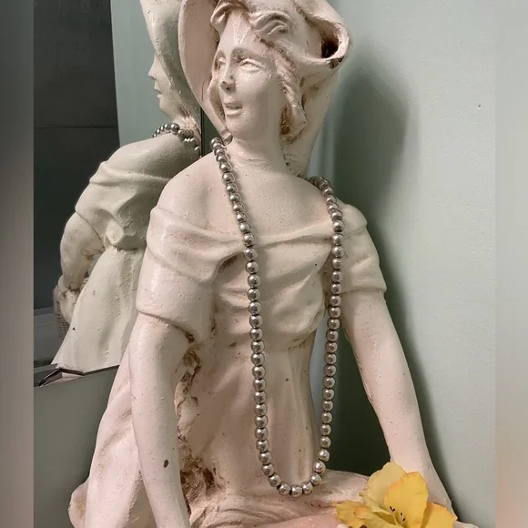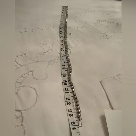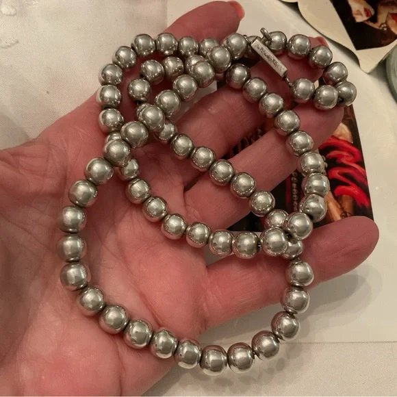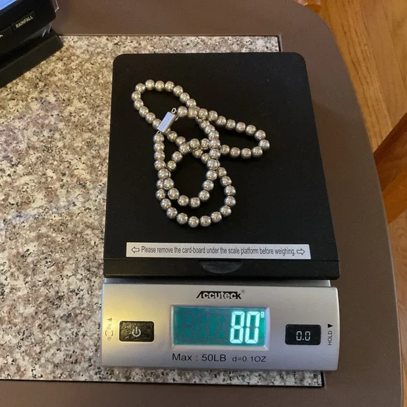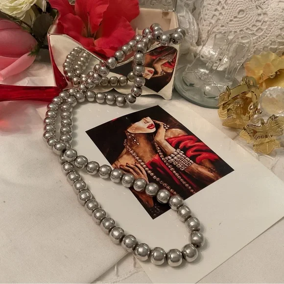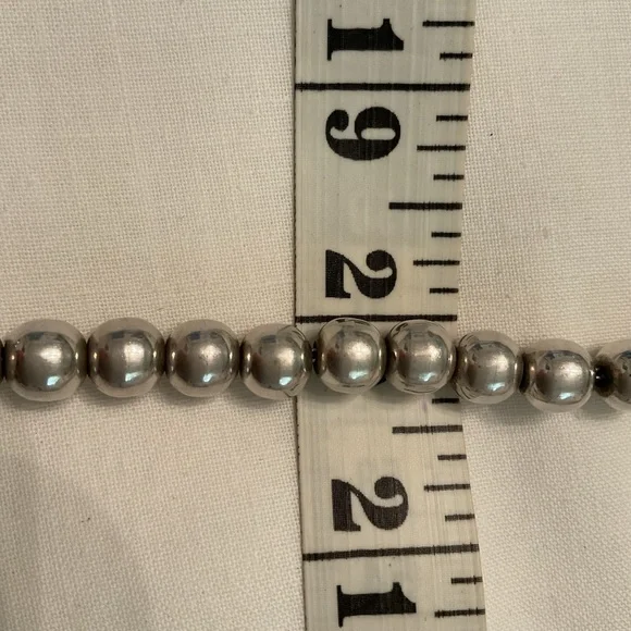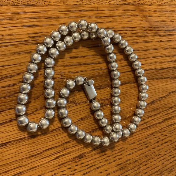 I HAVE FOR SALE A STUNNING VINTAGE 925 SOLID STERLING SILVER 8MM BEAD NECKLACE.IT IS 24” LONG WITH BOX CLASPIT IS STRUNG ON A VERY STURDY STERLING CHAINVERY SOLID WEIGHING80 GRAMS.IT IS HANDMADE IN TAXCO, MEXICO.I HAVE PICTURES OF THE MEASUREMENTS, HALLMARKING AND WEIGHT.I CARRIED THIS BEAUTIFUL LINE FROM J&M DESIGNS, DALLAS, TEXAS FOR 25 YEARS.THEY DESIGNED AND HAD MANY OF THEIR PIECES MADE BY ARTISTS IN TAXCO.ANY QUESTIONS PLEASE ASK.THANKS FOR SHOPPING MY CLOSET, PAM