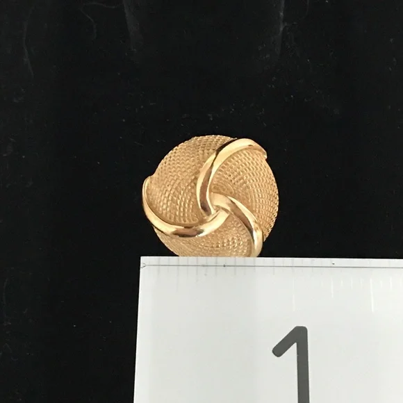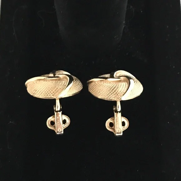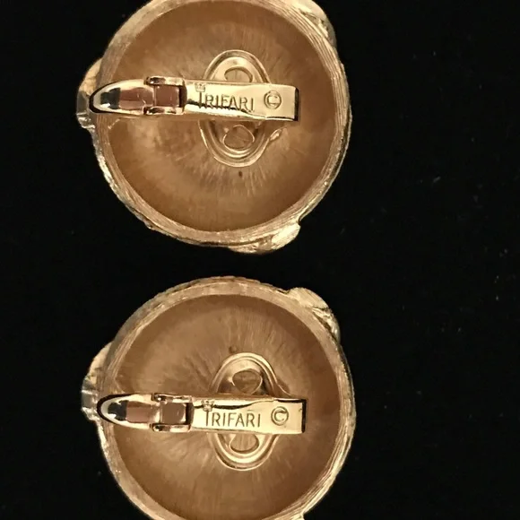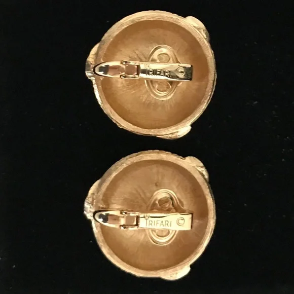 Rare vintage CROWN TRIFARI gold tone statement earrings!Clip-on earrings from the 1960s with a swirl and basketweave design. *Price firm — rare vintage item Impeccable condition; looks like they have never been wornCOLORGold-toneSIZESee pics with ruler; approximately 14/16” wideAuthentic Trifari jewelry will have one of the following hallmarks:1955 – 1969 – TRIFARI CROWN / TRIFARI (w/ crown symbol & copyright mark)www.jewelry shopping guide.comTAGSCollectible TRIFARI, vintage, rare, & clip-on earringsOUR CUSTOMER SERVICEItems are stored in a smoke-free, clean, perfume-free environment, carefully inspected & cleaned (if preloved) before shipping, & then wrapped & quickly shipped.Extra attention placed on packaging to protect items, being environmentally conscious in choice of packaging materials, & communicating with customers during shipping process. WHAT YOUR PURCHASE SUPPORTSA percentage of proceeds from net sales supports the veterinary care of a recently rescued senior cat & the needs of selected animal rescue agencies.