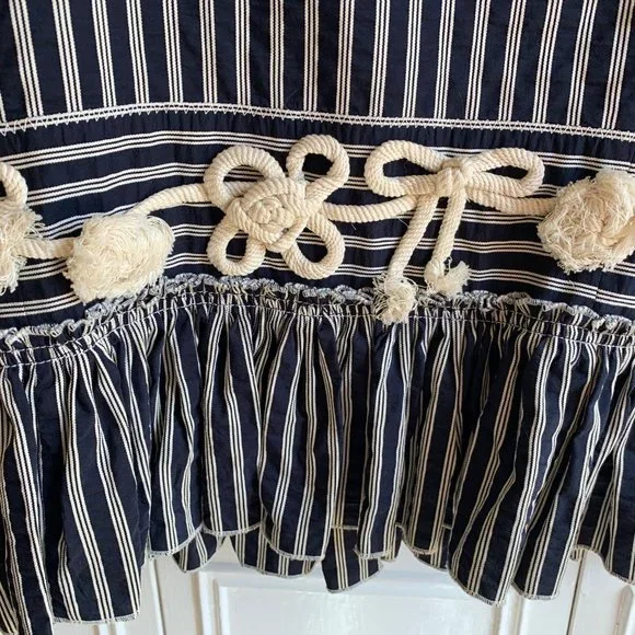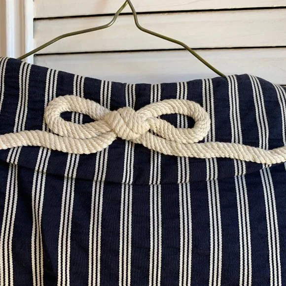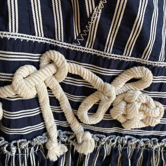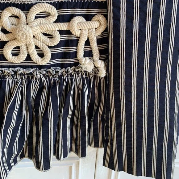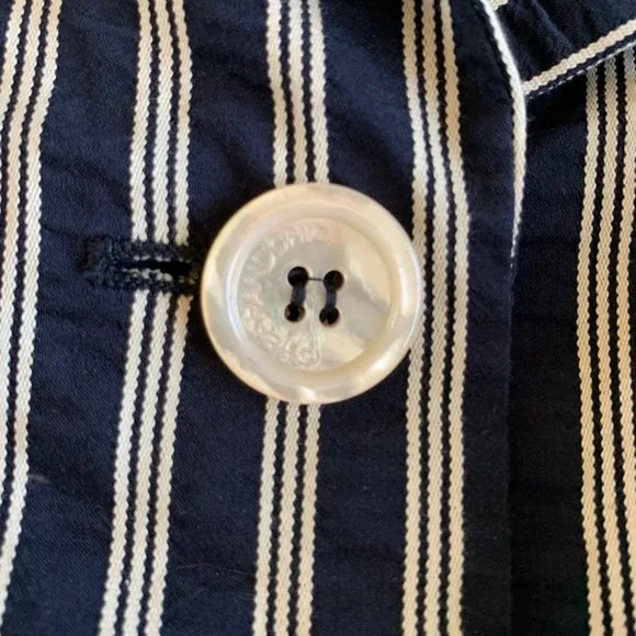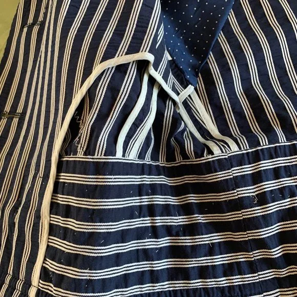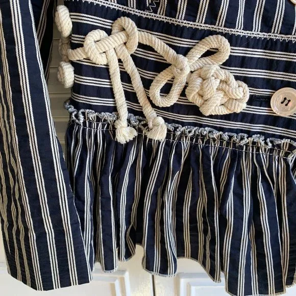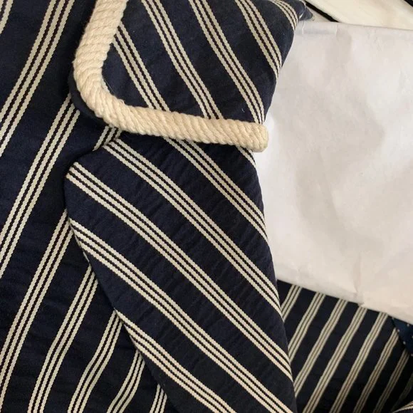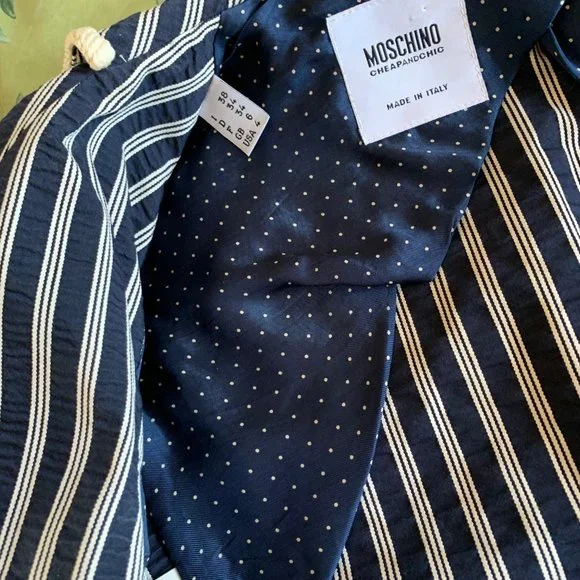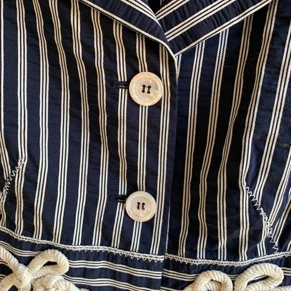 ADORABLE blazer from the Italian fashion house, Moschino. Features a navy-blue background with cream vertical and horizontal stripes, waist detail with braided cream rope and...