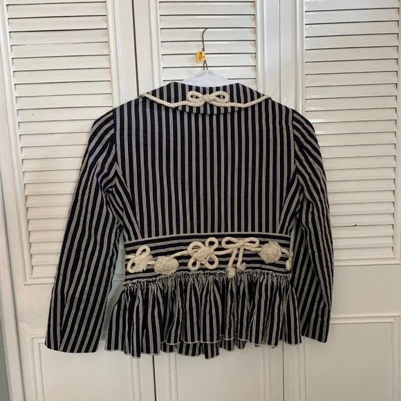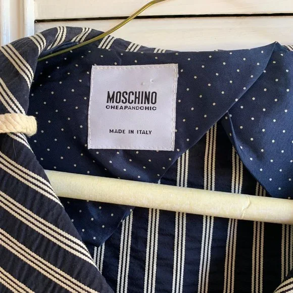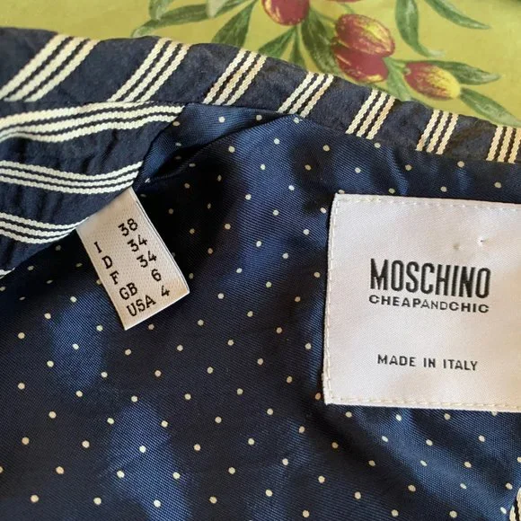 ADORABLE blazer from the Italian fashion house, Moschino. Features a navy-blue background with cream vertical and horizontal stripes, waist detail with braided cream rope and flower motif, a gathered peplum at the hem, cream rope braiding around the collar, and three mother-of-pearl buttons that say Cheap and Chic. Also has a blue silk with cream polka dots interior lining around the neck. AMAZING FIND!