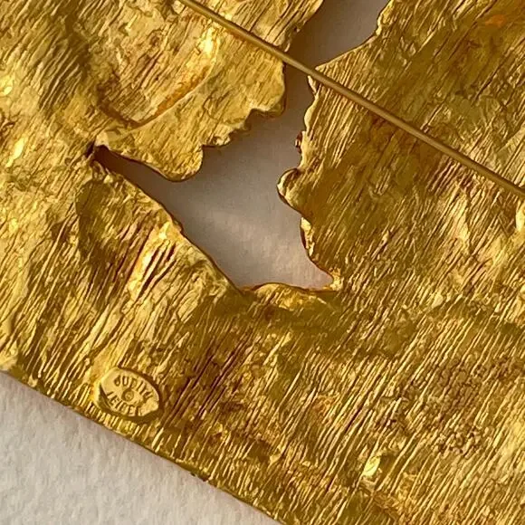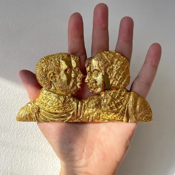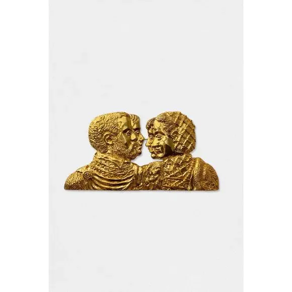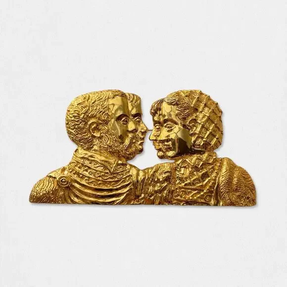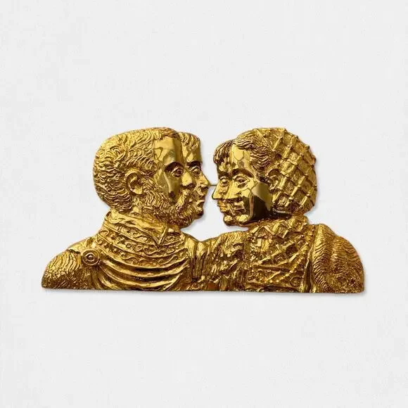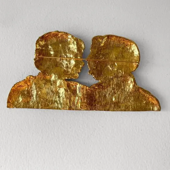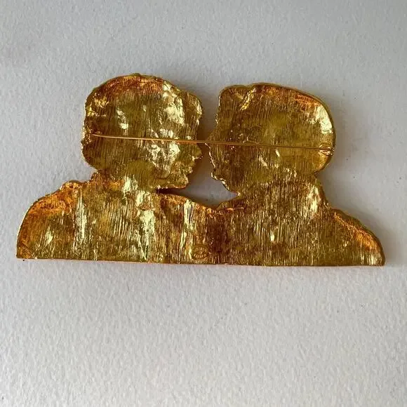 An interesting and uniquepiece of jewelry.Four heads dressed in renaissance costume, two men and two women facing each other. If you look closely at the details you can see thewomen has a fox stole. Signed Judith Lieber Very good vintage condition with minimal wear Weight: 107.39 grams Measures 5.5” x 2.75”This is a hefty piece of gold tone metal. It needs a sturdy lapel. It would also look nice on a sash. I wonder what Judith was thinking
