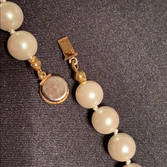 50 KNOTTEDWHITE FAUX PEARLS..20” LONG INCLUDING SLIDING,ROUND , GOLDEN CLASP.WEIGHS 1.5 Oz.LIKE NEW .NO BOX.T2