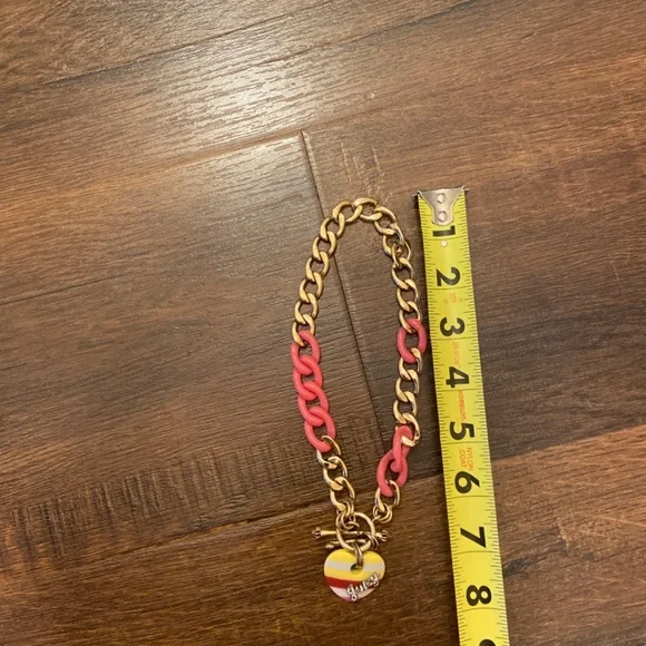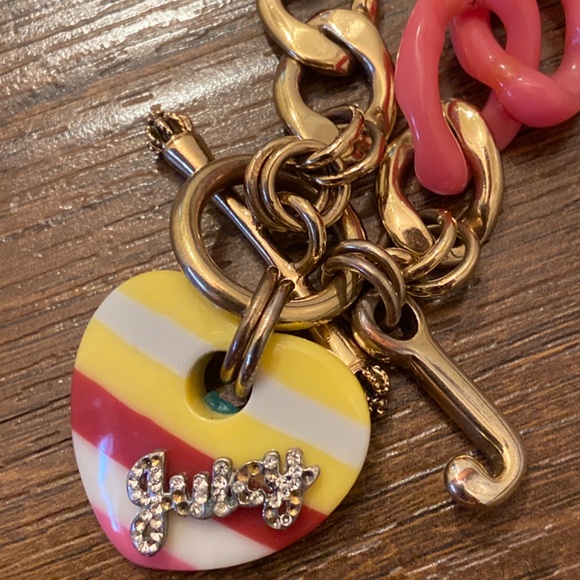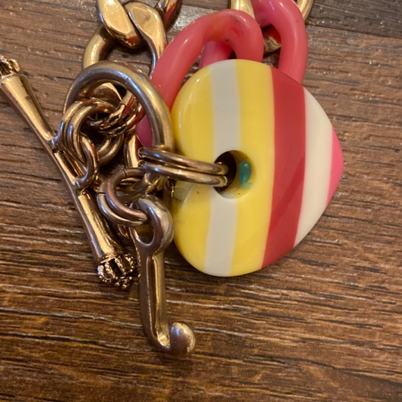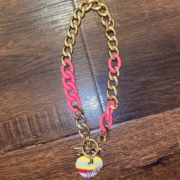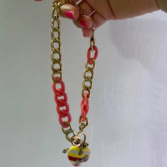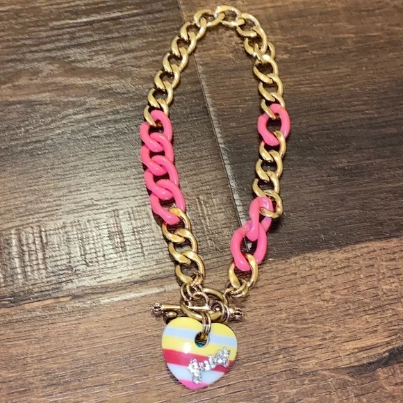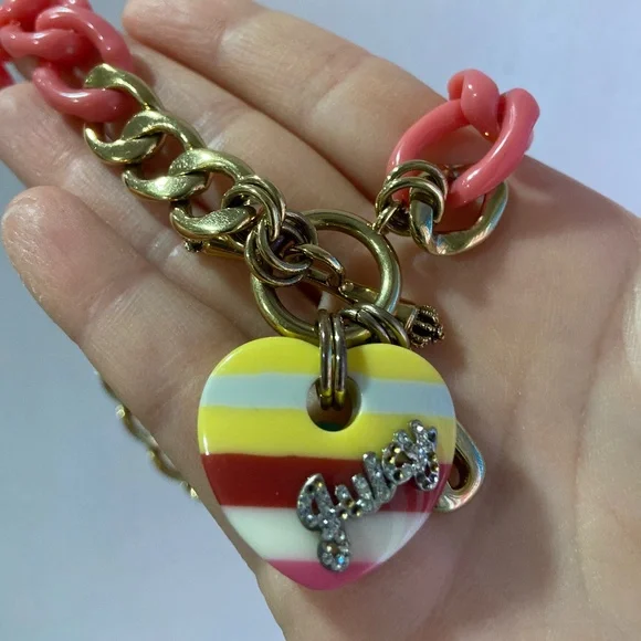 Y2K NEW VINTAGE JUICY COUTURE BANNER HEART CHAIN NECKLACE CHOKER NECKLACE Nautical red yellow striped heart PAVE JUICY RHINESTONE DETAIL GOLD TONE AND PINK LINKS VERY RARE AND HARD TO FINDNO BOX INCLUDED