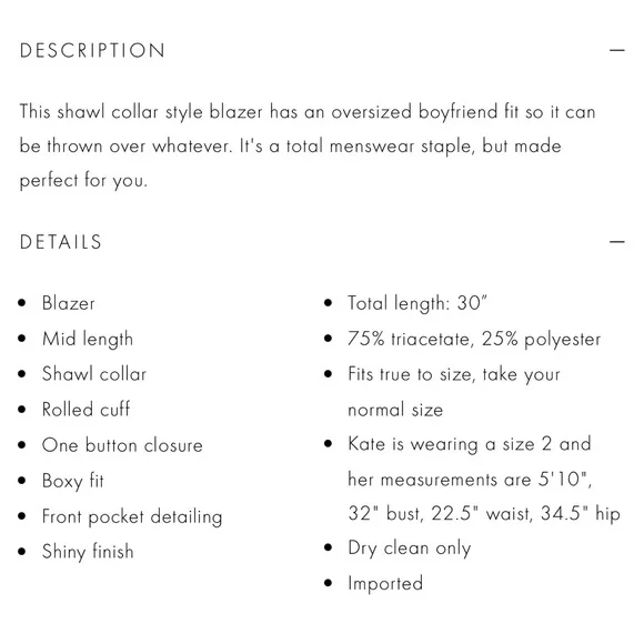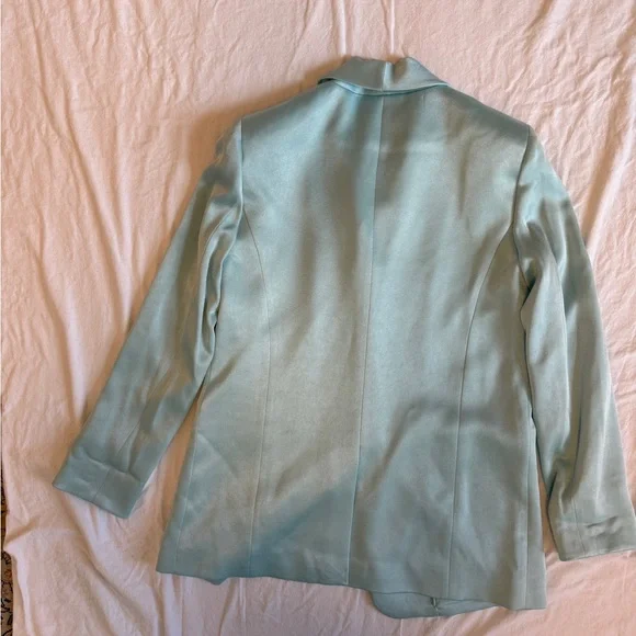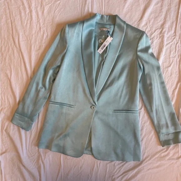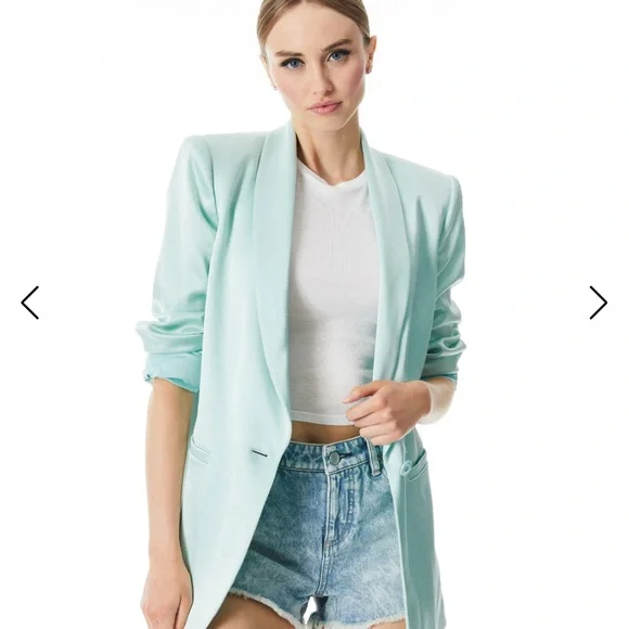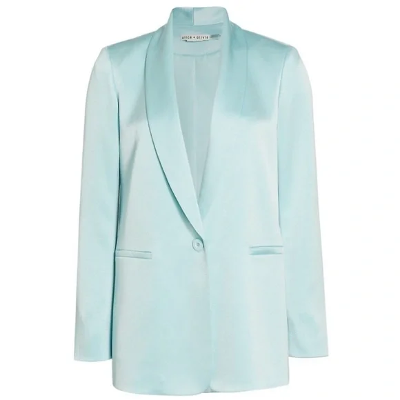 Elevate your style with this chic powder blue blazer by Alice + Olivia - NWT. Perfect for any occasion, it adds a fresh touch of striking elegance and style to your wardrobe.YURIKO SHAWL COLLAR BLAZERThis shawl collar style blazer has an oversized boyfriend fit so it can be thrown over whatever. It´s a total menswear staple, but made perfect for you.MSRP: $495BlazerMid lengthShawl collarRolled cuffOne button closureBoxy fitFront pocket detailingShiny finishTotal length: 30”75% triacetate, 25% polyesterFits true to size, take your normal sizeKate is wearing a size 2 and her measurements are 5´10", 32" bust, 22.5" waist, 34.5" hipDry clean only