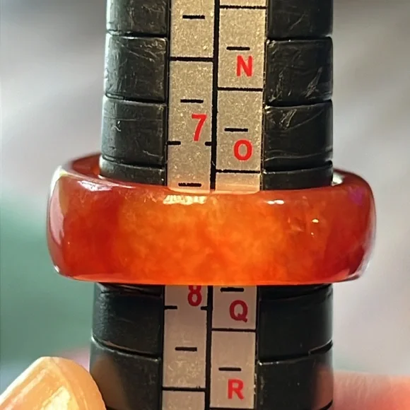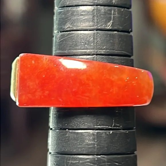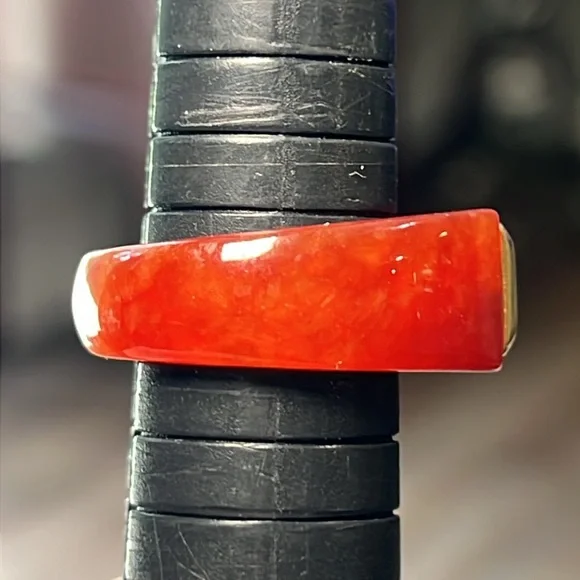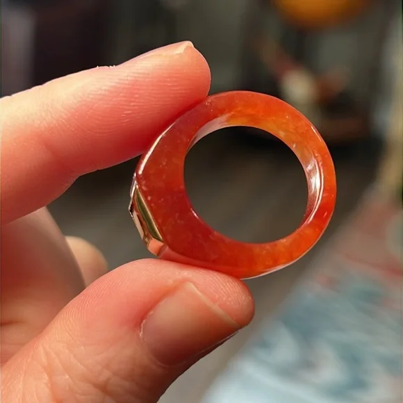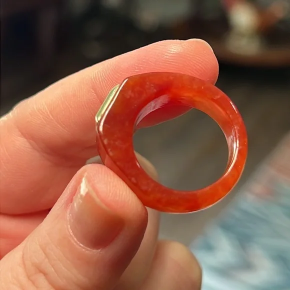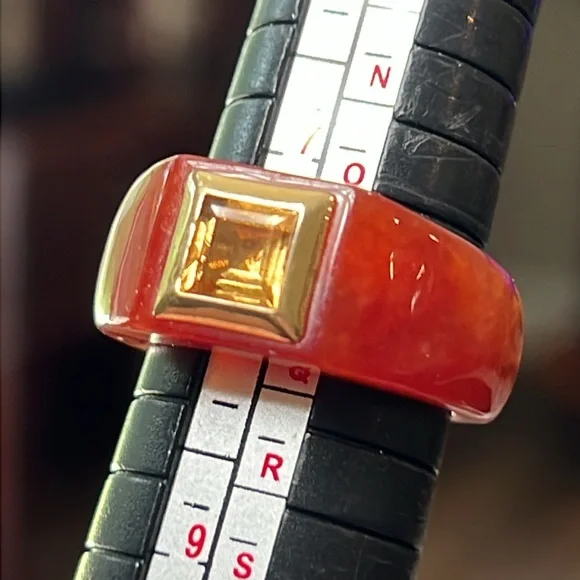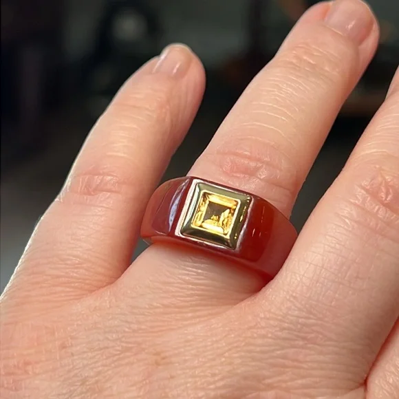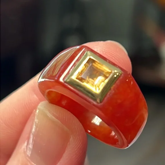 Great condition Beautiful red jadeite jade with acid tested 14k solid gold and a genuine citrine in the center Size 7.75Similar to catbird and mejuri style