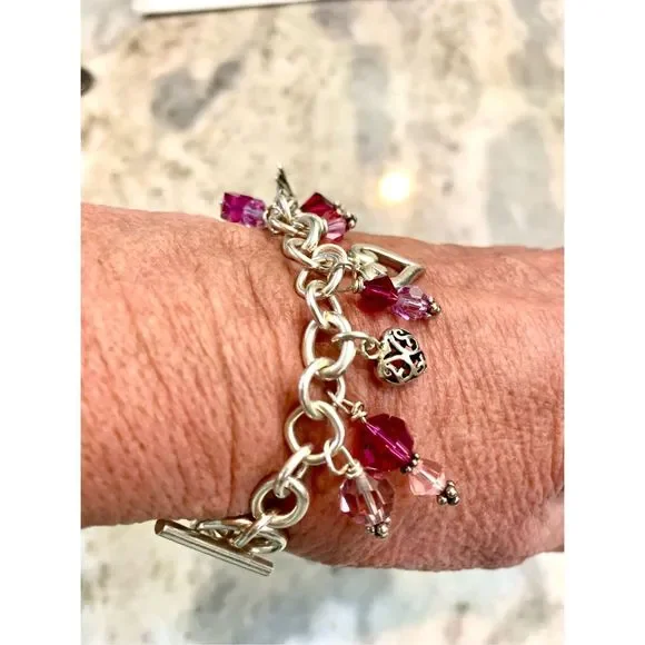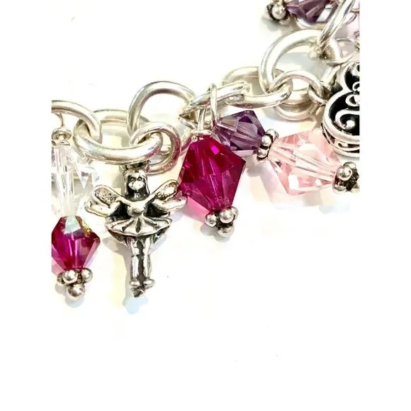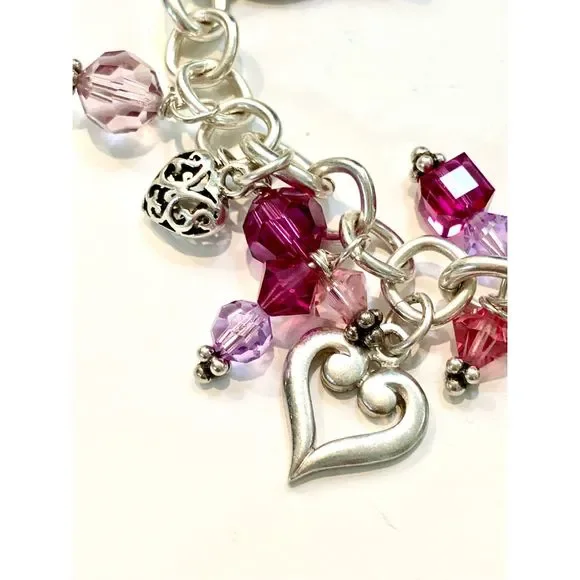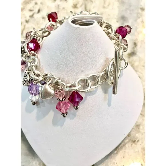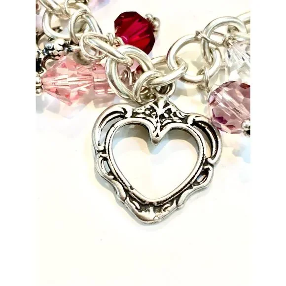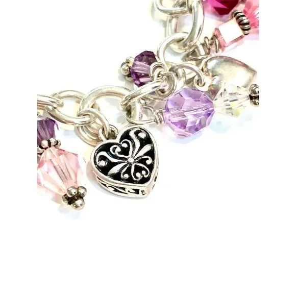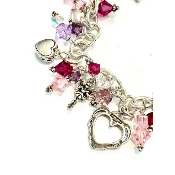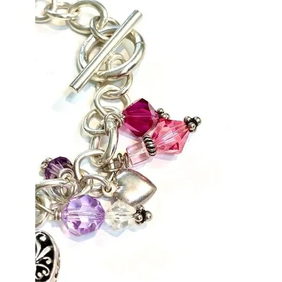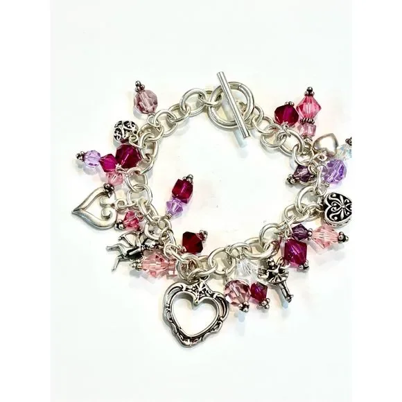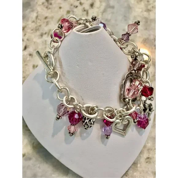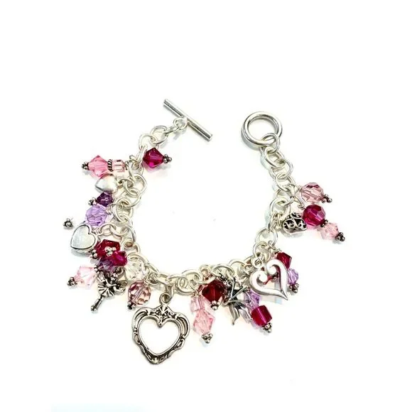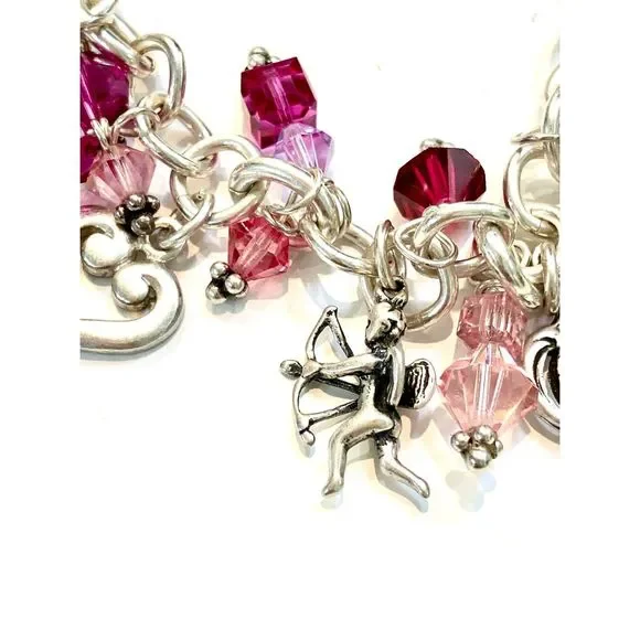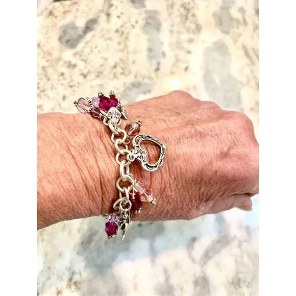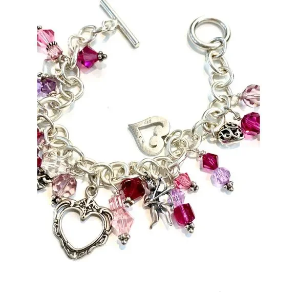 #stunning #keepsake 8” Sterling Silver Charm Bracelet with Toggle Clasp.Bracelet has been created with #Love in mind. 5 unique Heart Charms - 1 Cupid - 1 Fairy and lots of Swarovski Crystals for sparkle.4 of the charms are retired, limited edition .925 Sterling Silver #valentine #vintage #vintage heart charm bracelet #love #hearts
