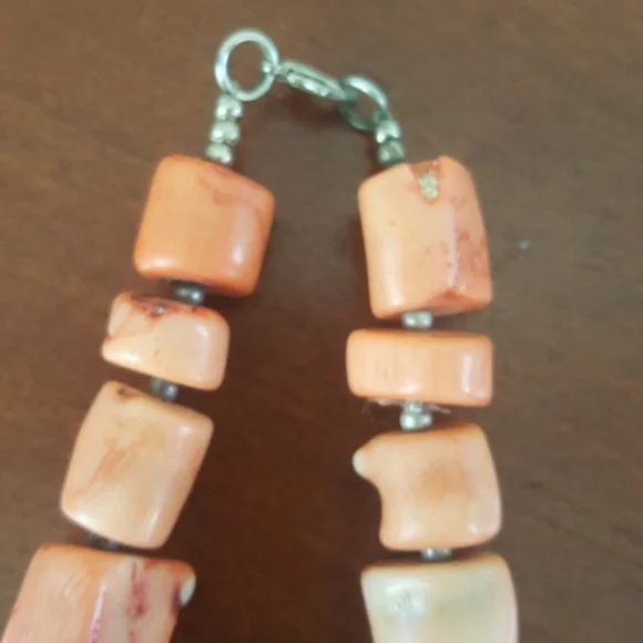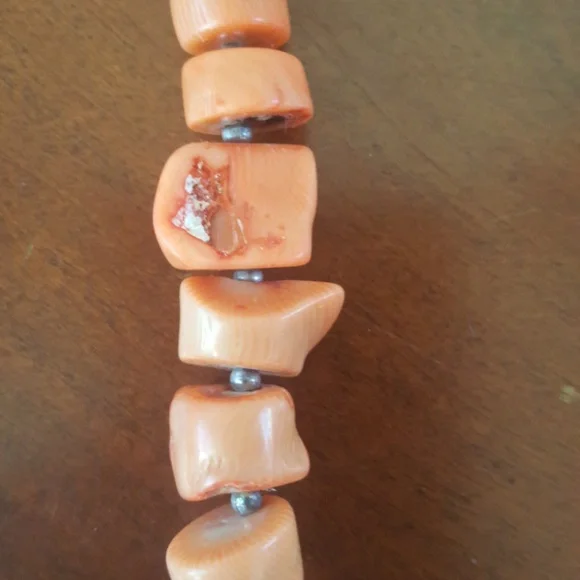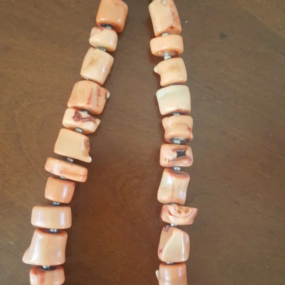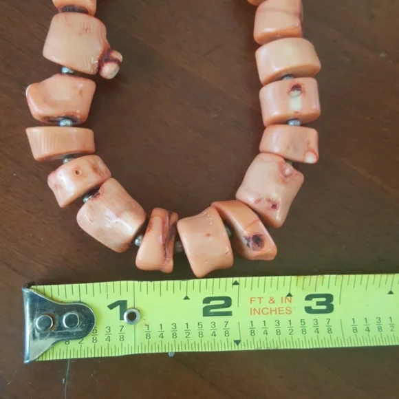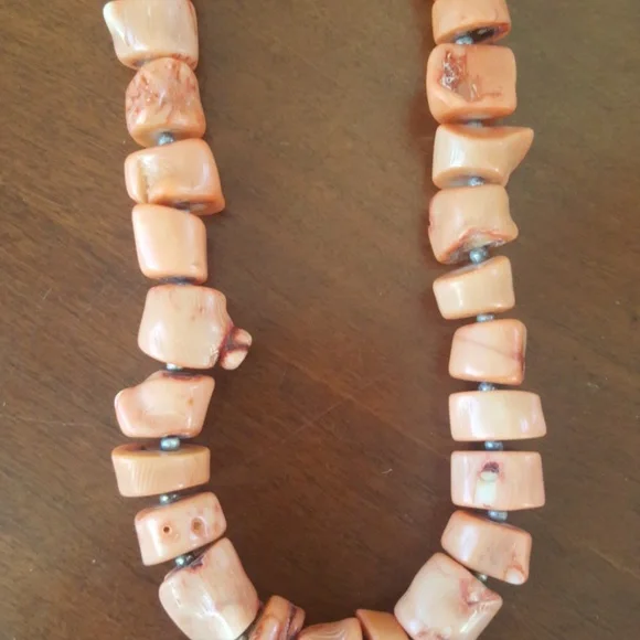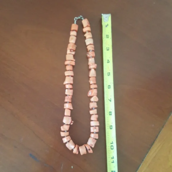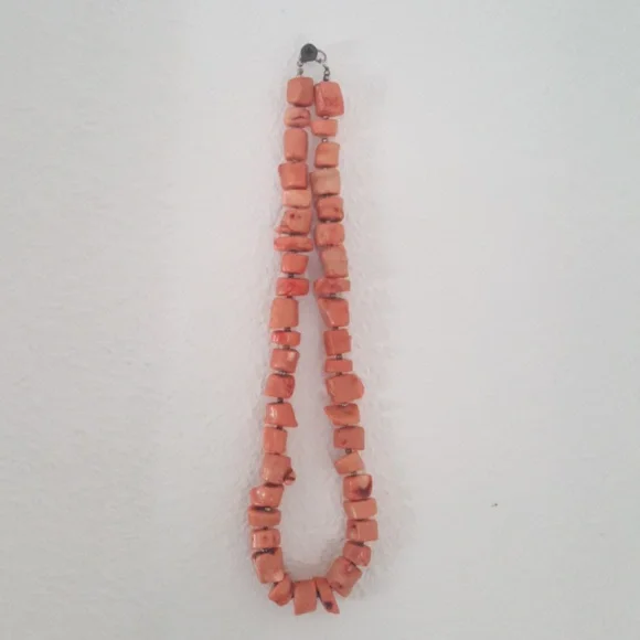 Vintage pink coral necklace hand made with bead like pieces. Approximately 20".