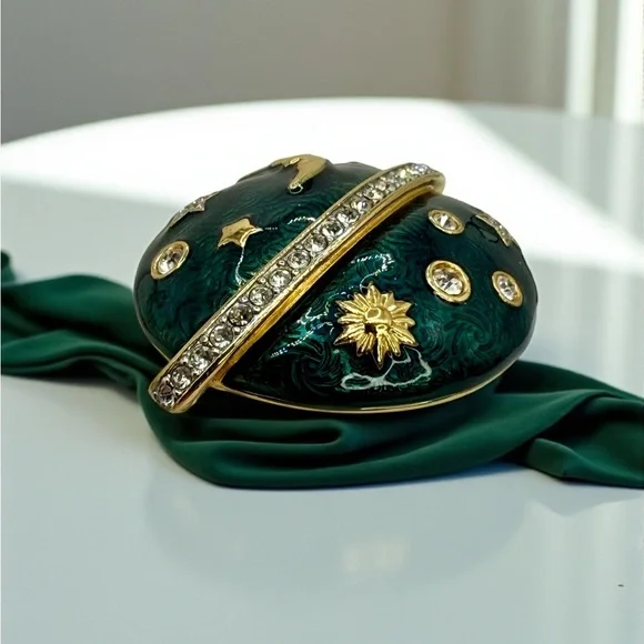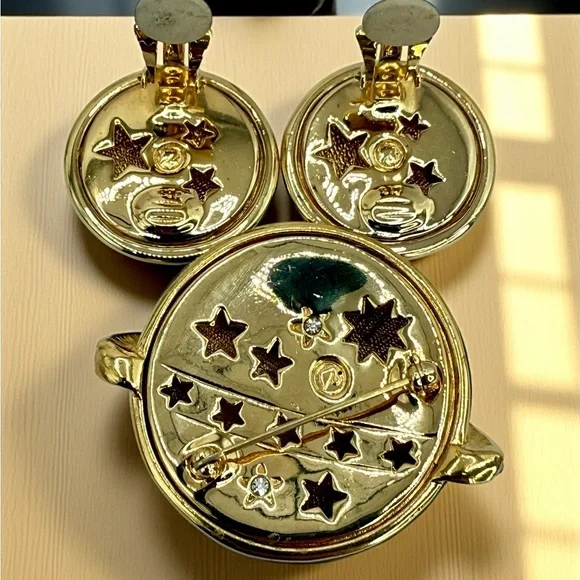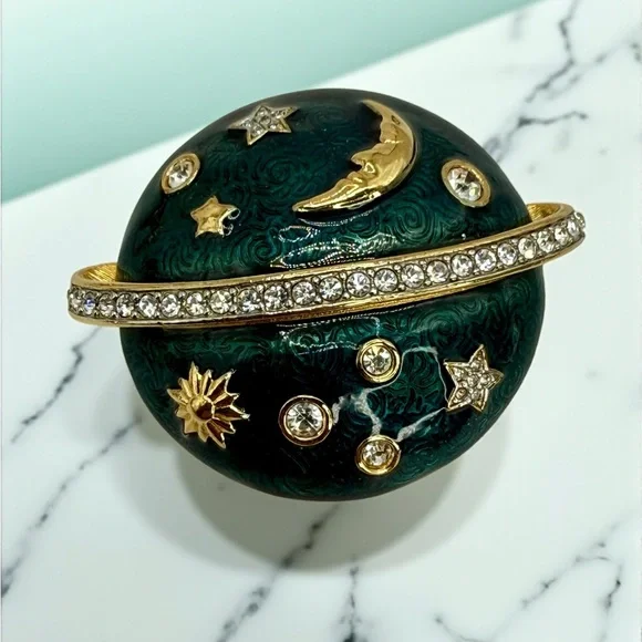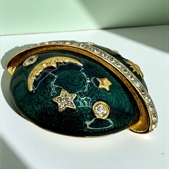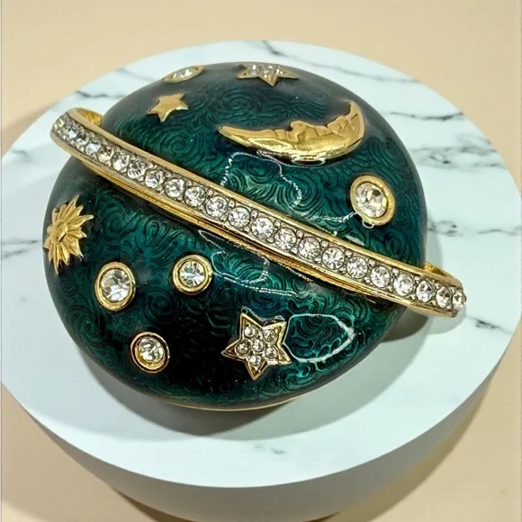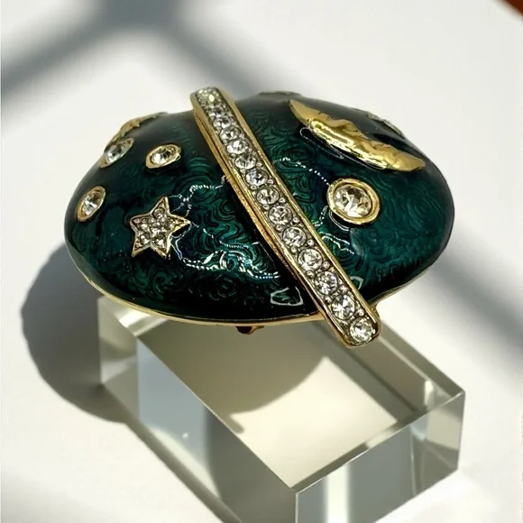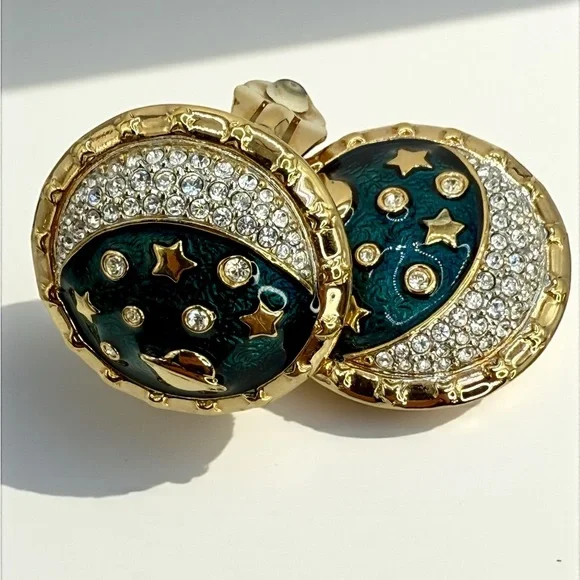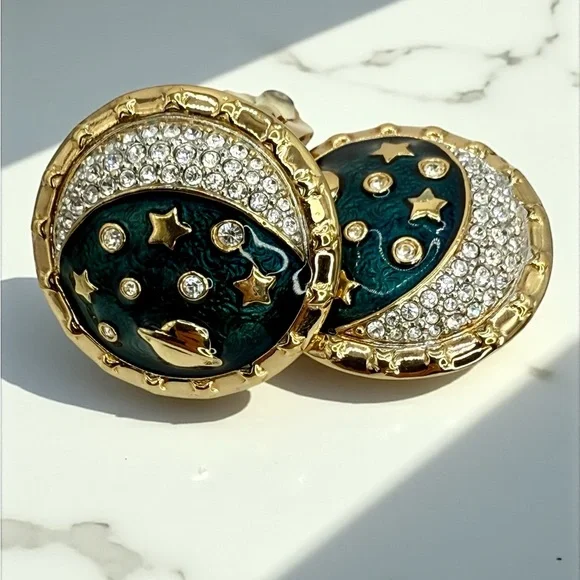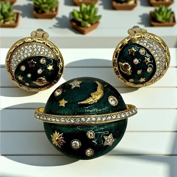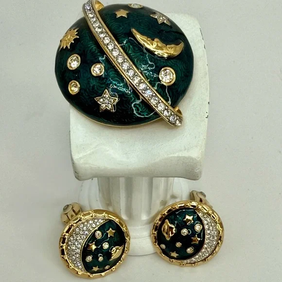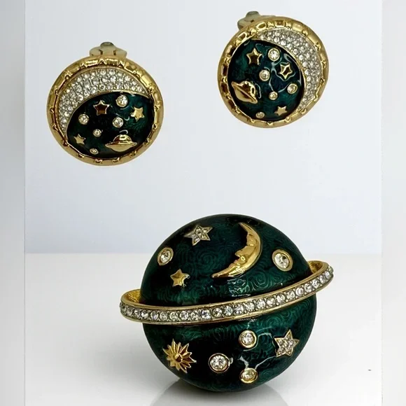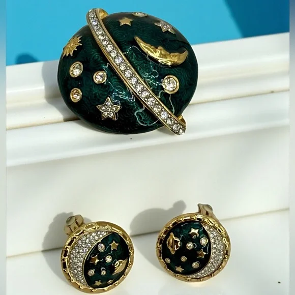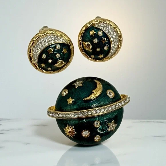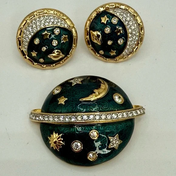 Vintage Swarovski Moon & Stars Planet Brooch and Earrings Set – Signed, Celestial Design, EUCTransport yourself to the cosmos with this dazzling vintage signed Swarovski brooch and clip-on earrings set, designed in a whimsical celestial “planetary” motif. The dimensional brooch is crafted in rich emerald green enamel with golden accents and sparkling pavé-set crystals. Adorned with raised golden moon, stars, sunburst, and Saturn motifs, the brooch is styled like a planet with a crystal-covered orbiting ring.Matching round earrings feature the same rich enamel background, set with stars, planets, and pavé crystal crescents. Each piece is signed with the Swarovski swan logo on the back.Details:•Designer: Swarovski•Era: Vintage (likely 1990s)•Set Includes: 1 brooch + 1 pair of clip-on earrings•Brooch Dimensions: Approx. 2” diameter•Earring Dimensions: Approx. 1.25” diameter•Materials: Gold-tone metal, green enamel, clear Swarovski crystals•Backings: Clip-on earrings; brooch with secure pin clasp•Condition: Excellent vintage condition with minimal wear. All stones intact. Finish is bright and enamel is glossy.Hallmarks: Swarovski swan logo stamped on back of each piece.