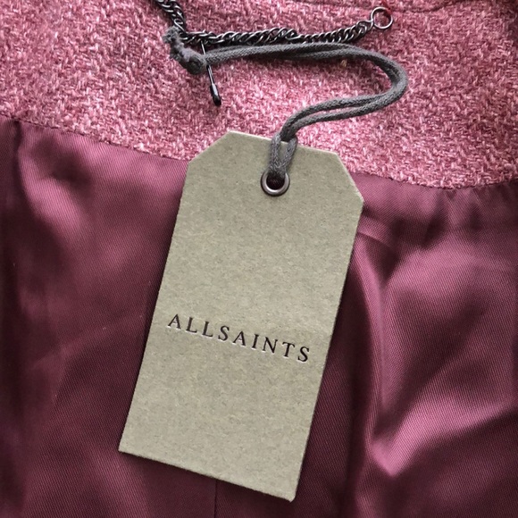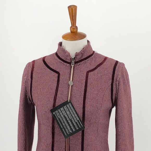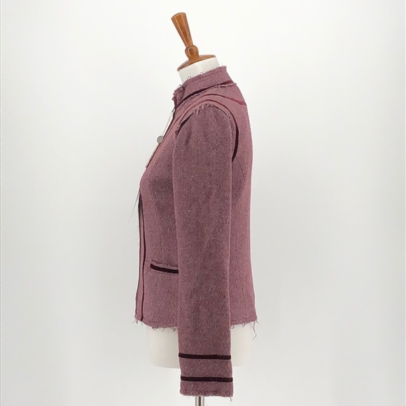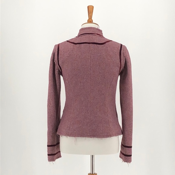 All Saints Plum Zipper Front Velvet Trim JacketFull zipper front light weight jacket with velvet trim details.Exposed / raw edges on hems and shoulder seams.Front slit...