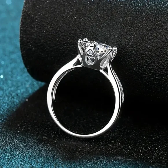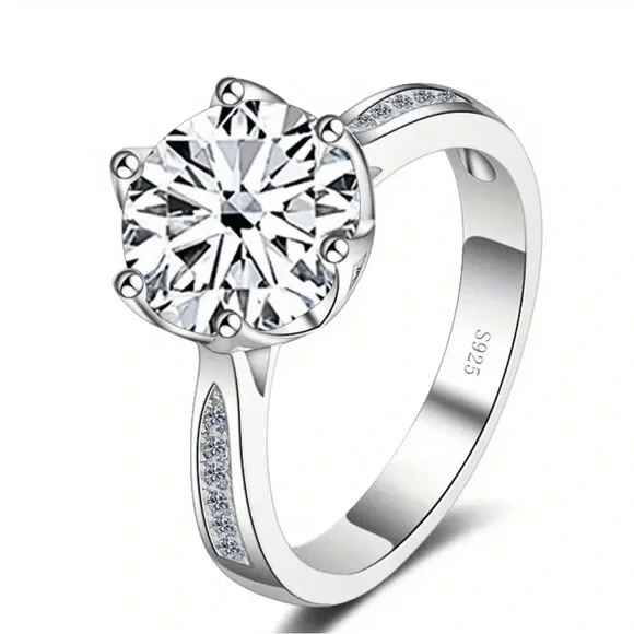 Beautiful green velvet ring box and polishing cloth included. Size: 6Gemstones: Genuine MoissaniteCarat Weight: 3ct. (center stone)Diamond Cut: Round/BrilliantColor Grade: DClarity: VVS1Metal Material: .925 Sterling SilverHallmark: S925Authentication: GRA Certificate Included#moissanite #diamond #silver #engagementring #rings #cocktailring