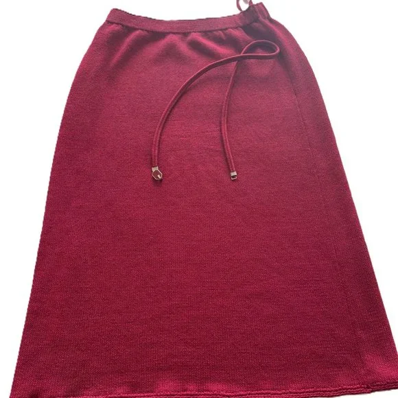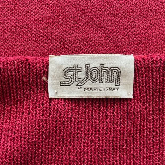 Elevate your wardrobe with this gorgeous vintage red St. John Collection by Marie Gray knit suit.Stretchy twist material of 80% wool and 20% rayon retains shape and resists wrinkling. Original still stretchy belt included. Price is for all three pieces. The suit is in very good condition. Two tiny repaired holes in the back of the skirt aren’t visible from the outside--see photo of skirt back. It’s a size 10 without a size tag. Measurements for TOP (lying flat) are front width: 18”.Back shoulder between sleeves:17.5”.Sleeve length: 21.5”, length:SKIRT is waist 12”, length 25” and hip 19”.