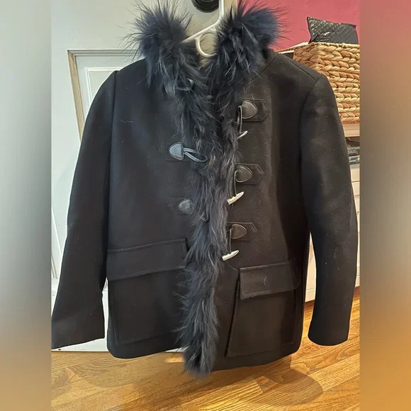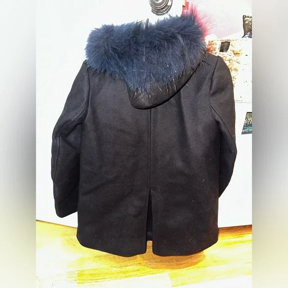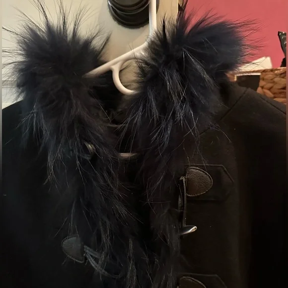 Only worn twice. Absolutely beautiful navy coat with navy soft faux fur. Extremely chic and elegant and in perfect condition.