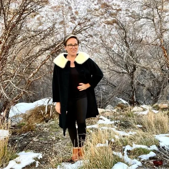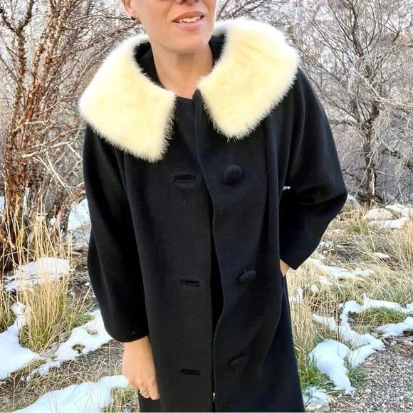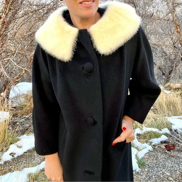 Stunning Outfit Show StopperVintage 1950s 1960s Dumas Desmond’s California Black Wool Blend and Faux Fur Cozy Winter Opera Over CoatSatin Poly linedLarge cover buttons3/4 length sleeveSoft faux fur collar Amazing condition considering ageNo size tag (Recommended Small-Medium) Please view measurements Model is a size 4Shoulder 21”Bust 21.5”Sleeve 18”Total length 38”This garment has been professionally dry cleanedPenny Lane