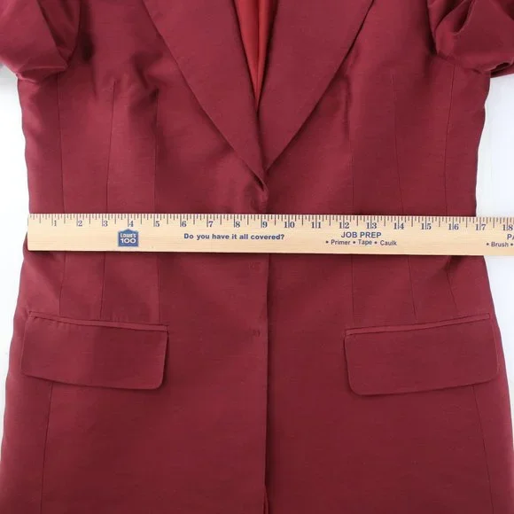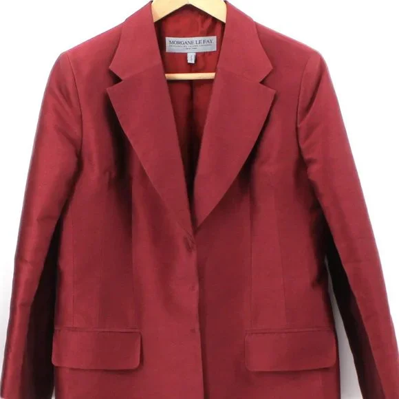 Deep red suit by Morgane Le Fay. Long line collared jacket with three snap closure. Pants are straight leg (on the wider side) with two front pockets and a smooth seat. This is silk and cotton blend with a slight sheen. Minimalist lines in a maximalist color. Can be worn separately for more mileage.This was worn once to a wedding and is in excellent condition. No flaws fading, or wear.Size 8Measurements are in the pics. Please compare them to items you already own to be sure of a happy fit. If you need different or more specific measurements just ask. I’m happy to answer your Qs. I’m friendly and usually around.and yes, I am open to offers.:)