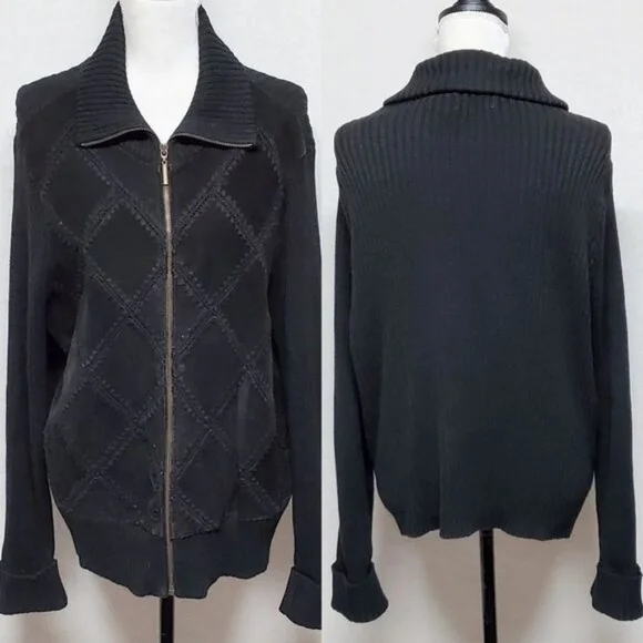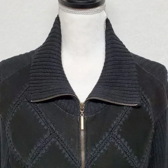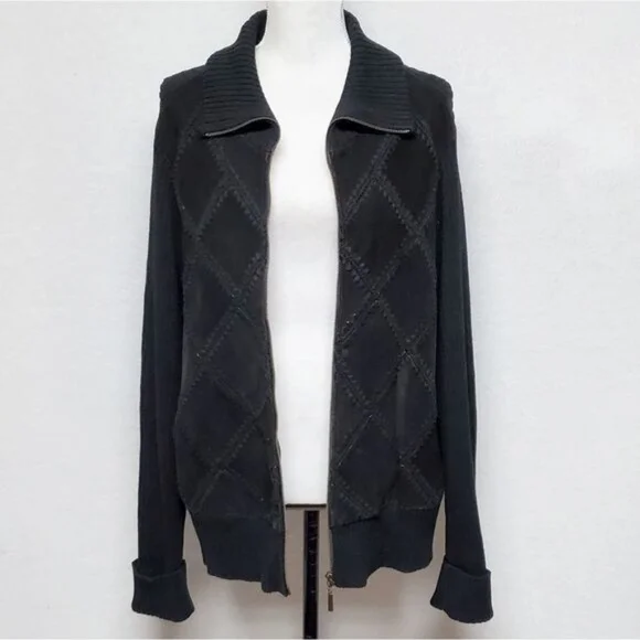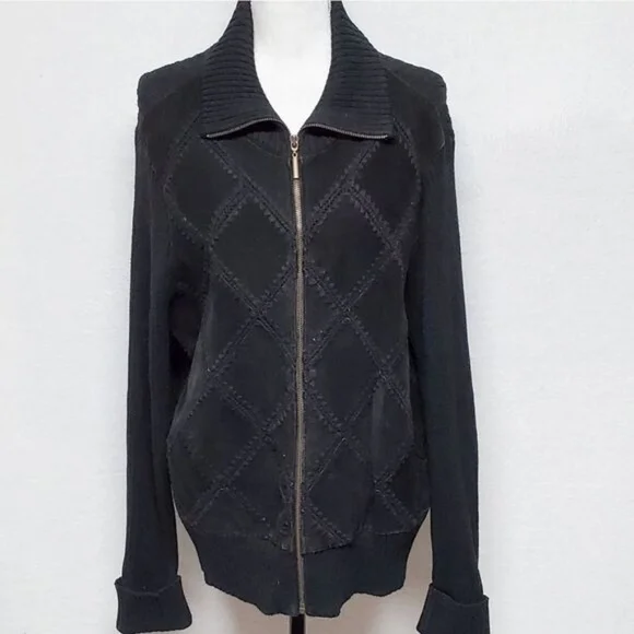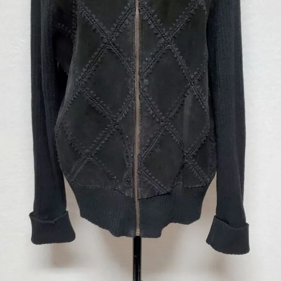 Vintage 1990s White Stag Black Suede Patchwork Leather Ribbed Knit Sweater Jacket.- Front Body Diamond Patchwork Leather- Dart Knit Trim around Leather- Back Body Ribbed Knit-...