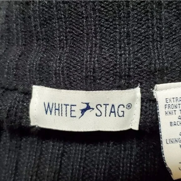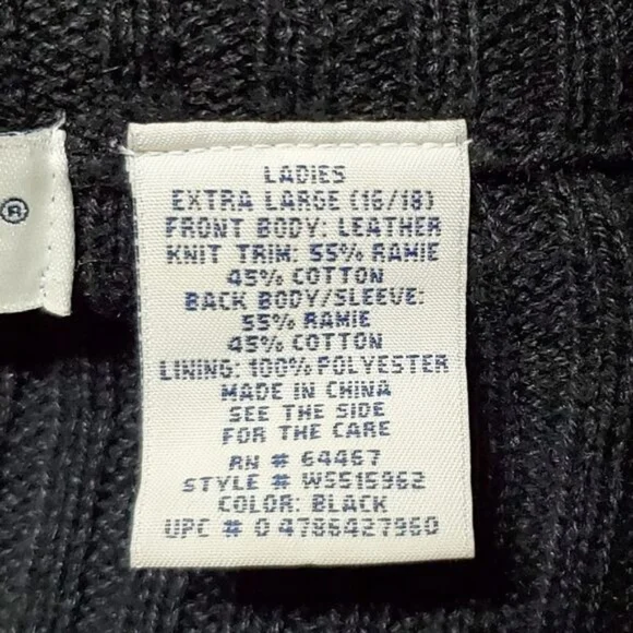 Vintage 1990s White Stag Black Suede Patchwork Leather Ribbed Knit Sweater Jacket.- Front Body Diamond Patchwork Leather- Dart Knit Trim around Leather- Back Body Ribbed Knit- Long Ribbed and Cuffed Sleeves- Full-zip Front- Pointed Collar Zips into Mock Neck CollarSize 16/18, XL, Extra LargeApproximate Measurements(Flatlay):Shoulder to Shoulder - 17 inchesBust - 23.5 inchesSleeve Length (Arm Pit Down) - 19 inchesLength (Shoulder Down) - 26 inchesNote: Stock photo is for reference only and may differ slightly from the actual item. Please refer to the actual images for an accurate representation of the product. The stock photo is provided to give an idea of how the item looks when worn.Vintage Retro Boho Bohemian Suede Leather Biker Punk Grunge Edgy 90s Alternative Goth Gothic Black Goth Jacket