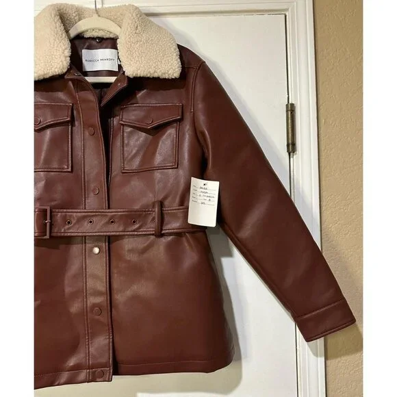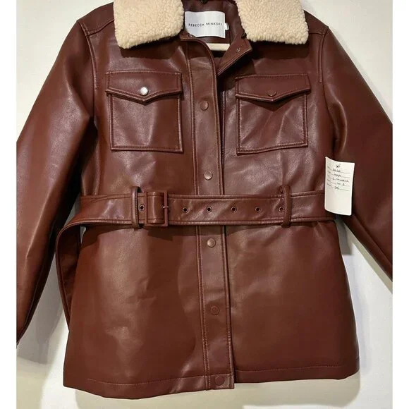 Rebecca Minkoff Faux Leather Jacket with Faux Shearling Collar - New w/ TagsSize - SmallColor - Chestnut-Belted Waist-2 Front flat pockets-Quilted Lining-Snaps on wrists-Faux shearling collar-Sample PieceApprox. Measurements - taken flat, not stretched out:AP to AP - 20"Shoulder to Hem - 27.5"Fabric:Faux LeatherRetail: $258 approx.