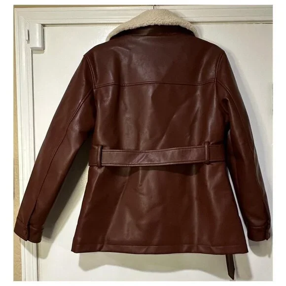 Rebecca Minkoff Faux Leather Jacket with Faux Shearling Collar - New w/ TagsSize - SmallColor - Chestnut-Belted Waist-2 Front flat pockets-Quilted Lining-Snaps on wrists-Faux...