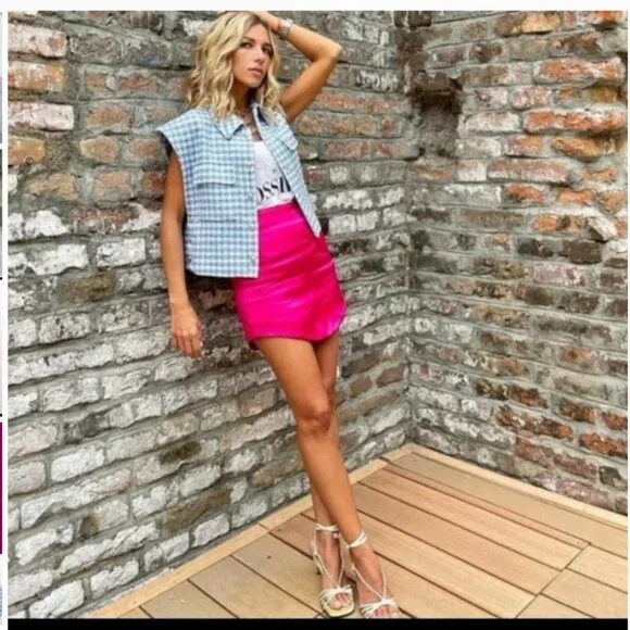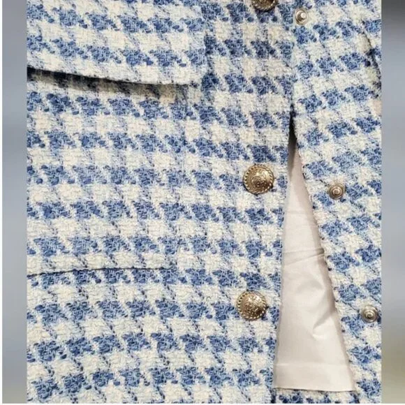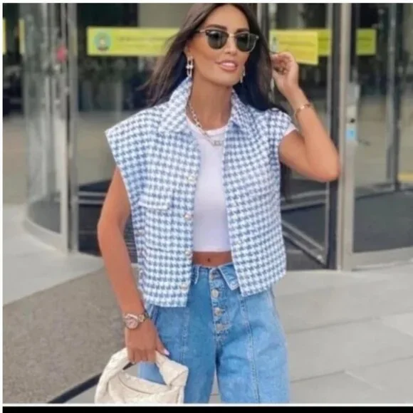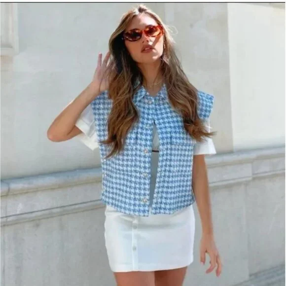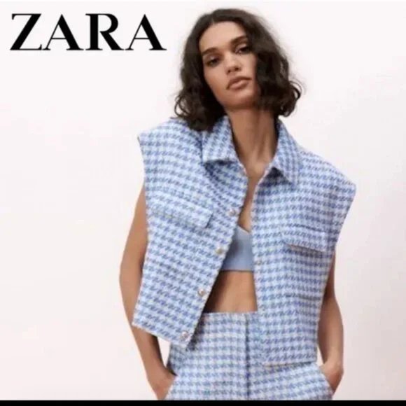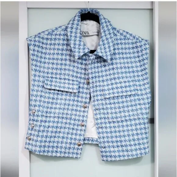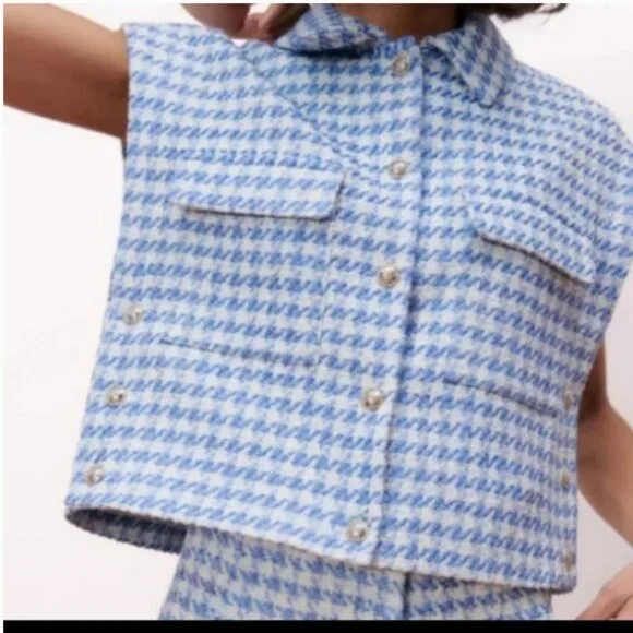 Zara Houndstooth Vest with buttonsNEW WITH TAG!Size: XSZara Blue/White Houndstooth Vest with silver buttons, new without tags.Bloggers favorite, this vest was sold out immediately from Zara store. Cropped vest with round neck. Contrasting inner lining. Buttons on both side. Functionals. Front closure with embossed buttons.