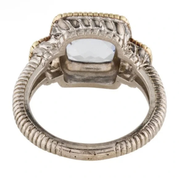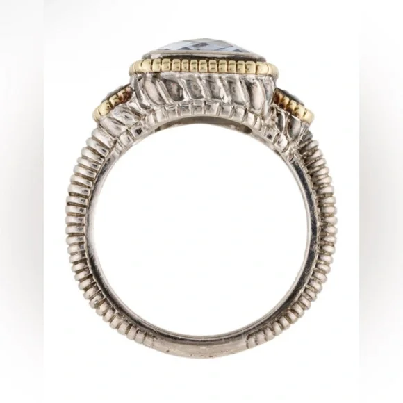 Judith Ripka RingSynthetic Quartz and Diamond RingSterling Silver and 18kt Yellow Gold Slight scratches and wear throughout metal Size 6 1/27.1 grams in weight