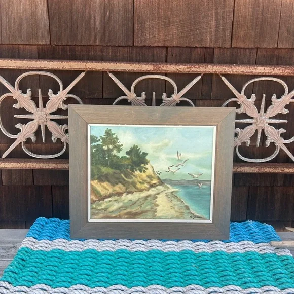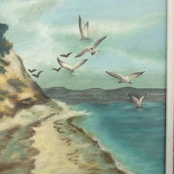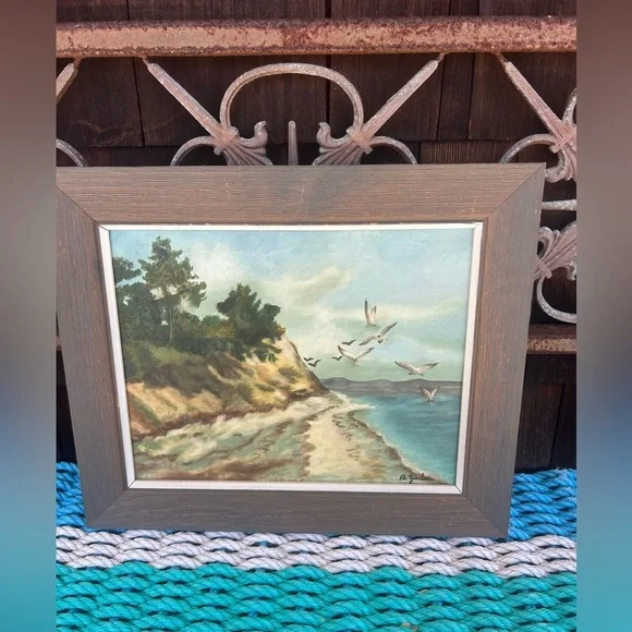 Vintage Framed Seaside Oil Painting Signed B. Zierler with Blue, Turquoise and Green Tones. Painting measures 11 x 14 inchesFrame measures 18 x 15 x .5 inchesFrame has scratches. In my opinion it adds to its charm. It’s easy to reframe if you want a more polished look. Features a serene beach scene with birds and trees.