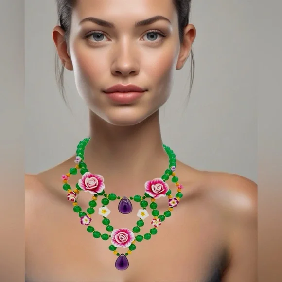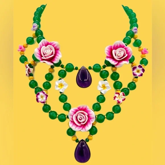 Flora"Wear your Garden" Statement Necklace. One of a kind handmade necklace.Unique and original will compliment your spring summer outfits. Wether styling your summer wedding guest dress or a casual fun outfit, this artwork jewelry will sure turn heads! Handmade polymer flowers, Amethyst Quartz, Jade, Czech glass, Druk glass, 18K over brass closure. 17" - 18" with extender.