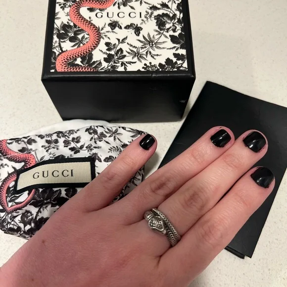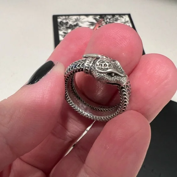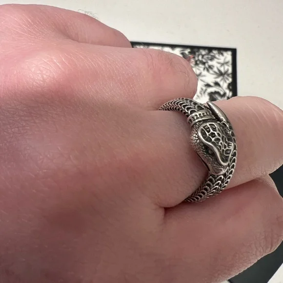 Elegant ring featuring a striking silver snake design. Perfect for adding a touch of luxury to any outfit.