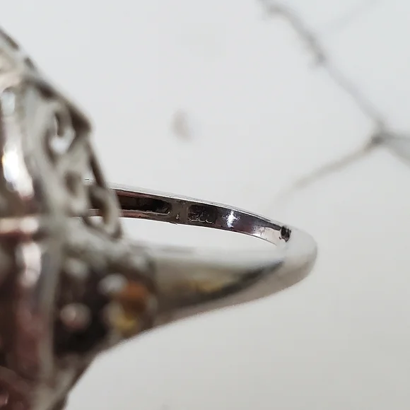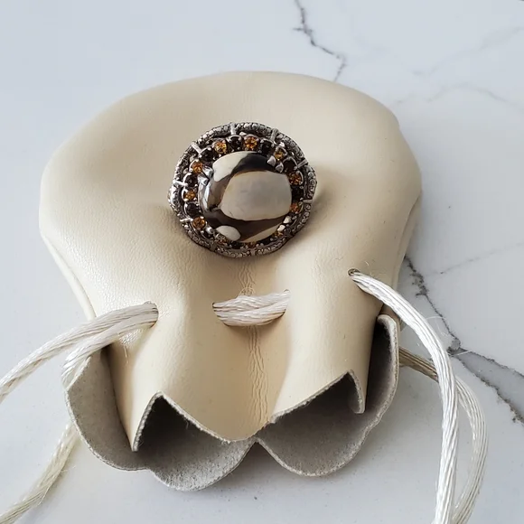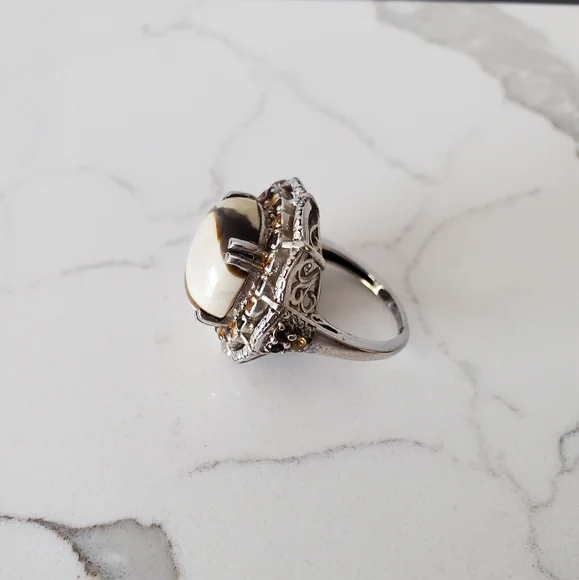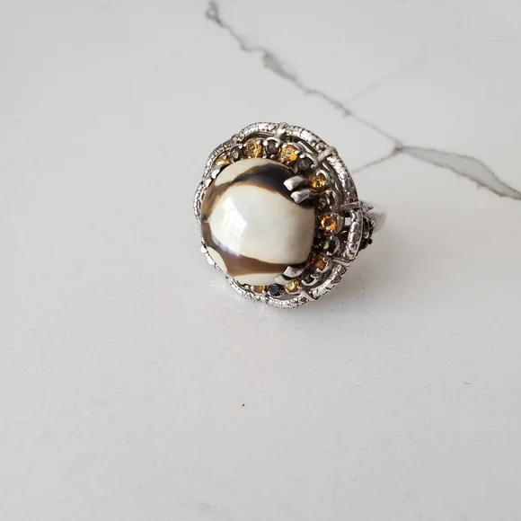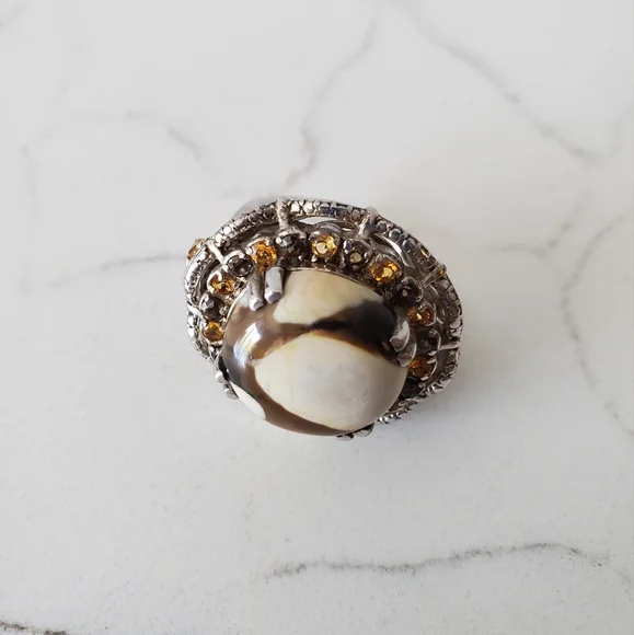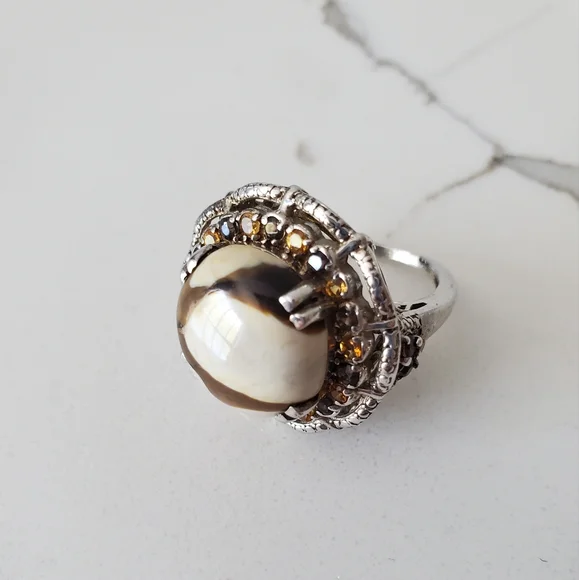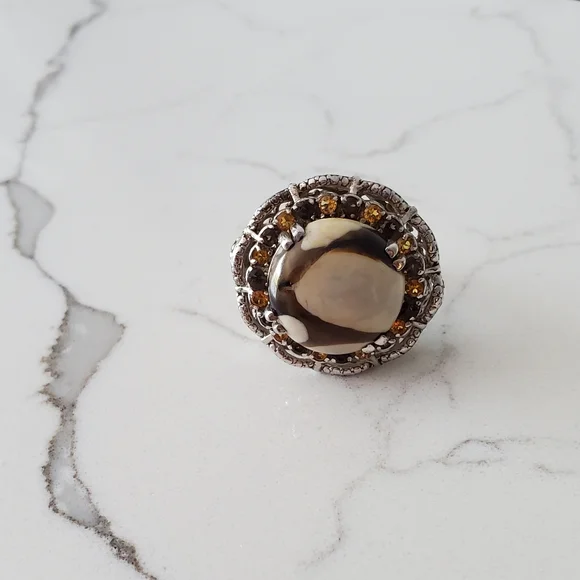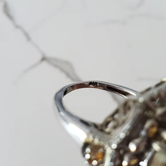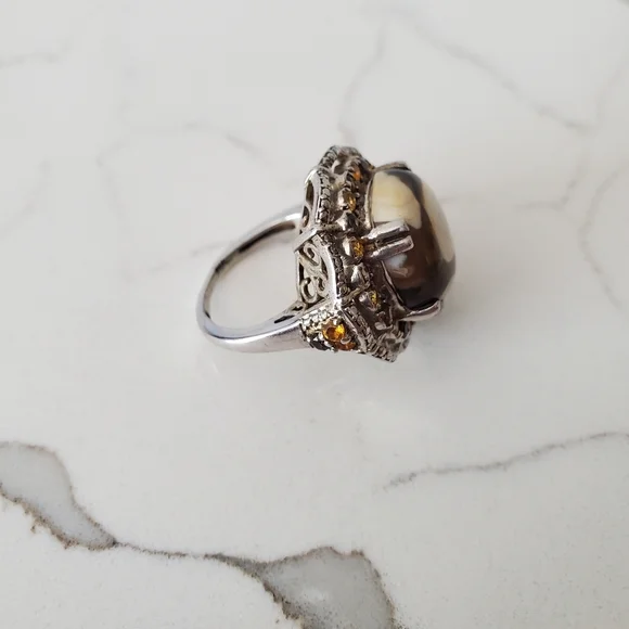 Peanut Wood Jasper, Brazilian Citrine and Brazilian Smokey Quartz Cocktail RingJasper: round cut, 9.15 ctCitrine: round cut, total 0.545 ctQuartz: round cut, total 0.545 ctSterling silverPlatinum overlayMarked 925 (not the clearest marking)Nickel freeSmoke-free pet-free home** Jewelry needs to be maintained to preserve its integrity. Bring to a jeweler at least every 6 months to check prong/setting strength and clean