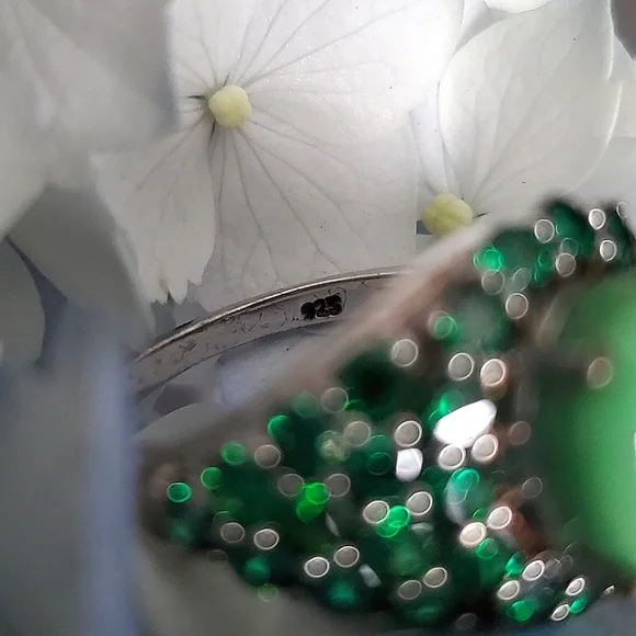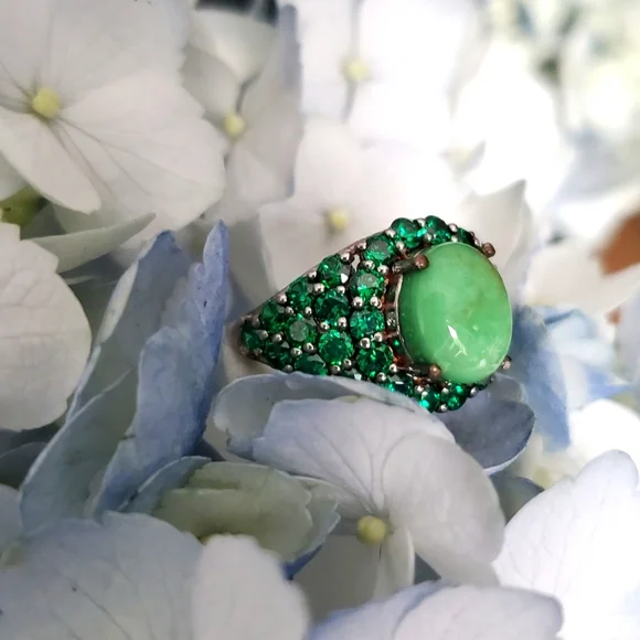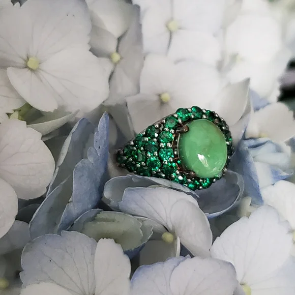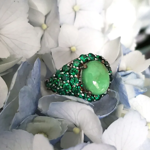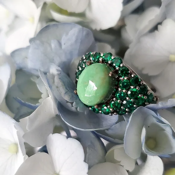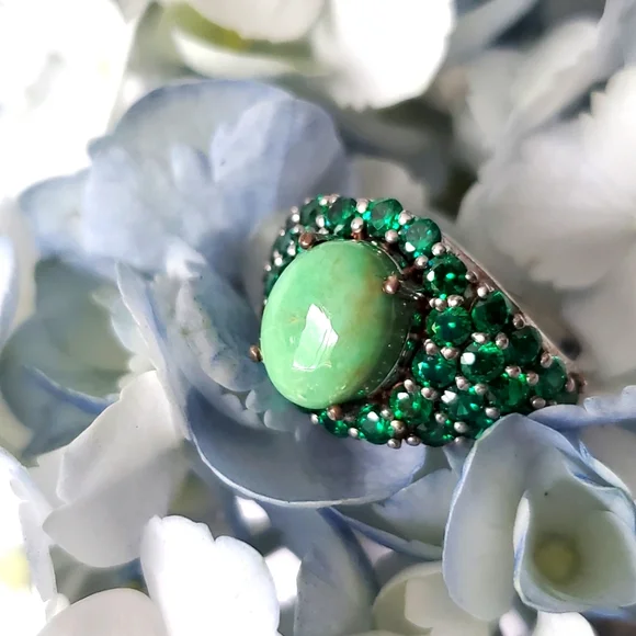 Utah Variscite and Created Green Diamond RingVariscite: round cut, 2.10 ctDiamond: round cut, total 4.10 ctSterling silverPlatinum overlayMarked 925Nickel freeSmoke-free pet-free...