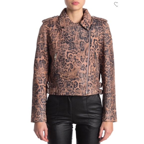 An exquisite leopard bold print adorns this moto jacket constructed from a lush leather!Lambskin LeatherAsymmetric zip frontEpaulets w/ snap closureAttached beltLinedZip cuffSide zip pocketsBelted HemShell: 100% Lamb LeatherBody Lining: 100% cottonDry cleanApprox Measurements (item flat)Chest: 19.25" (armpit to armpit)Sleeve Length: 23.75" (seam to end of sleeve) - last photoLength:22” (back collar to hem)Please don’t hesitate to ask questions! Thanks so much!