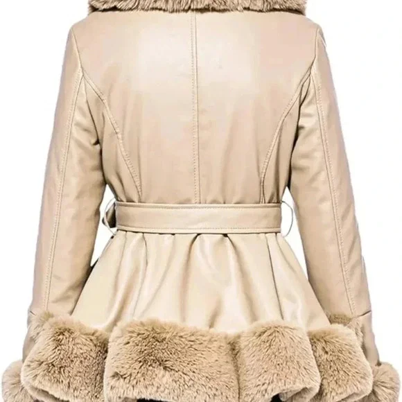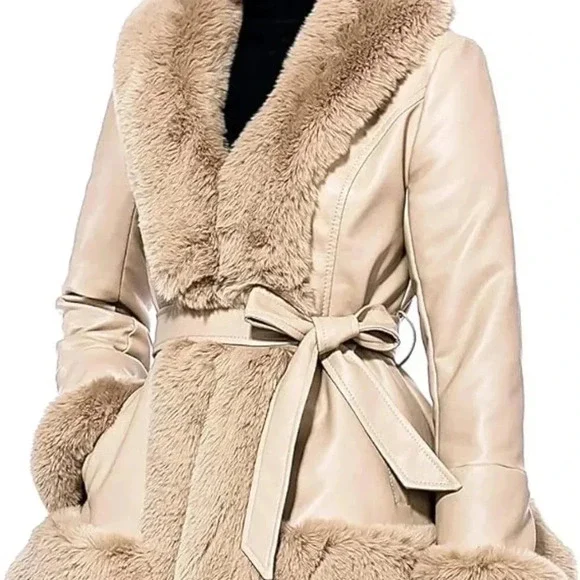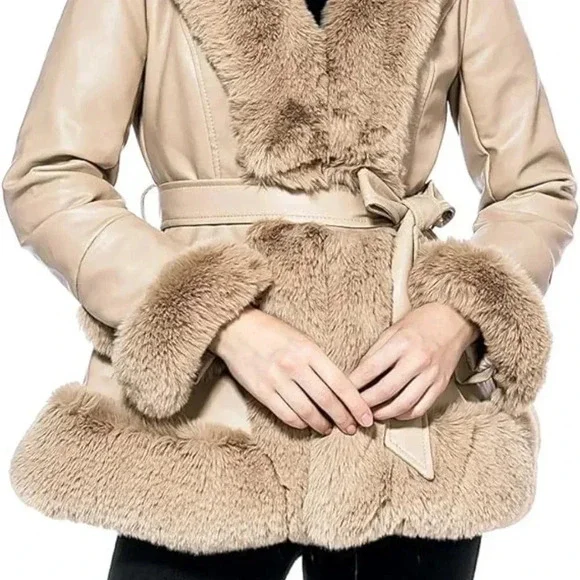 Faux Leather Jacket with Faux Fur Collar Long Sleeve Parka with Pockets Warm Winter Coat with BeltFabric Type68.8% Polyurethane, 28.3% Polyester, 1.6% Viscose, 1.3% CottonCare...