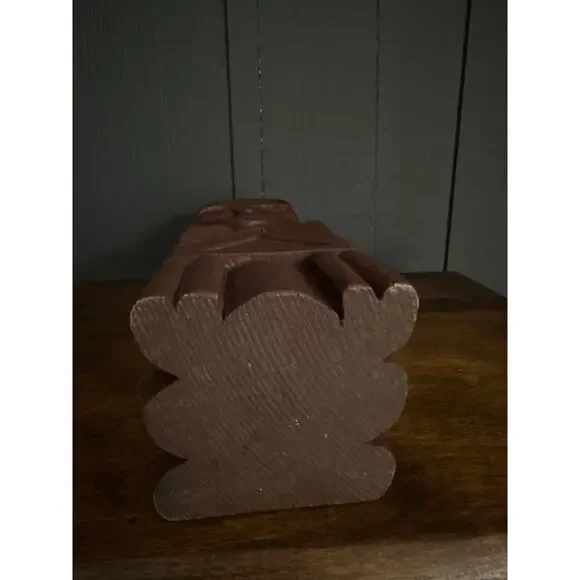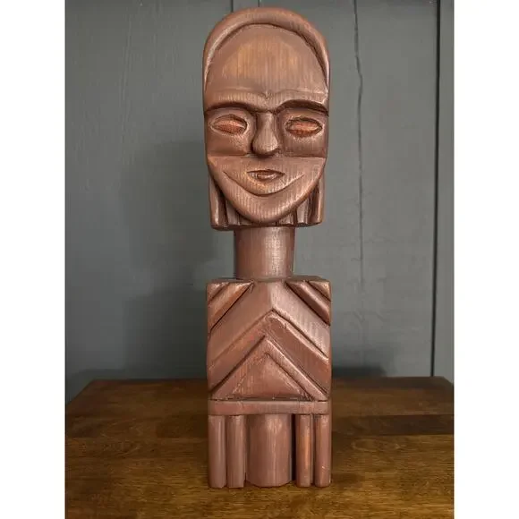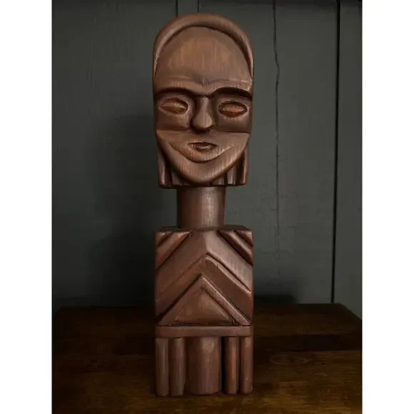 Hand Carved Wood Tribal Sculpture The sculpture pictured is a hand-carved wooden tribal sculpture, possibly of African or South American origin. It features a stylized human face and geometric patterns carved into the body. These types of sculptures often serve as ritual objects or symbols of spiritual power and connect the earthly realm with the spiritual world. Excellent Condition Measurements in Photos