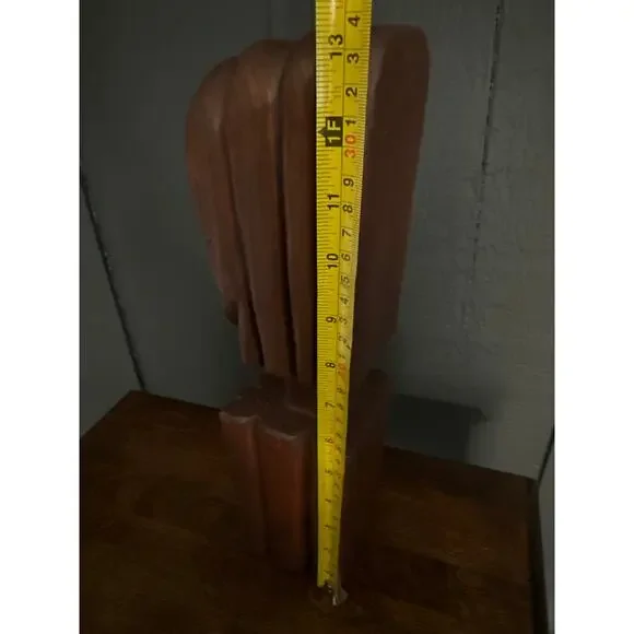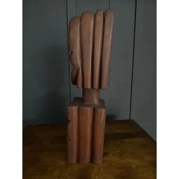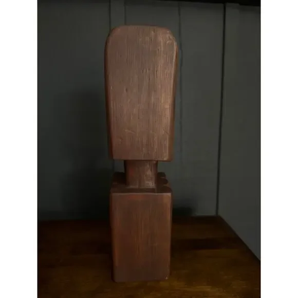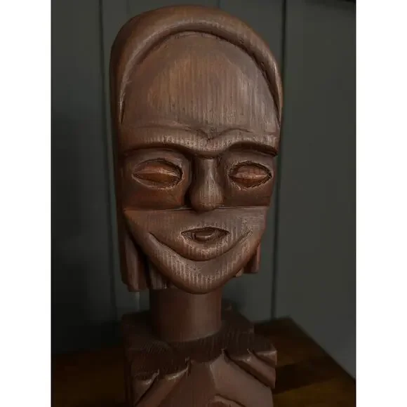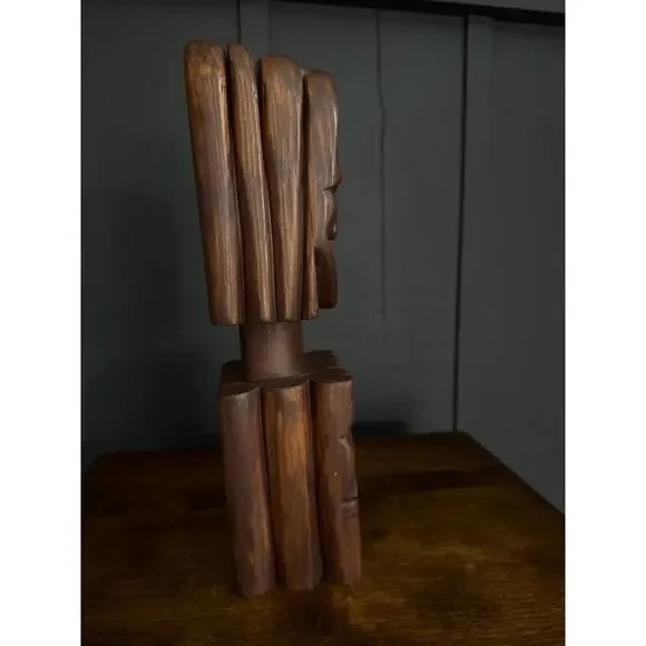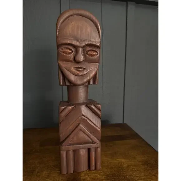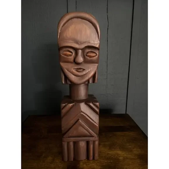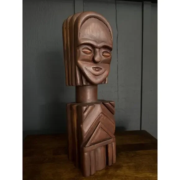 Hand Carved Wood Tribal Sculpture The sculpture pictured is a hand-carved wooden tribal sculpture, possibly of African or South American origin. It features a stylized human face...