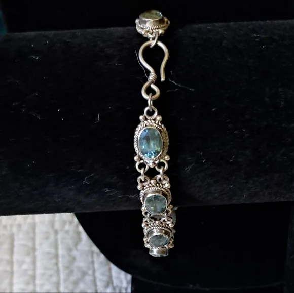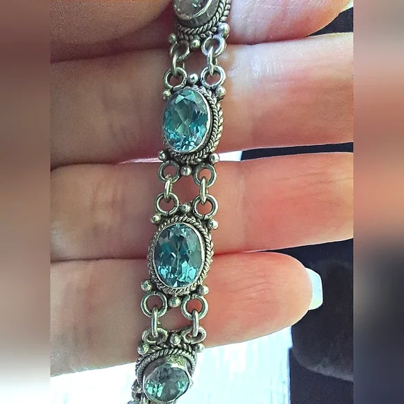 Beautiful faceted natural Swiss blue topaz solid sterling silver hallmarked handmade artisan bracelet. Beautiful detailing and excellent craftsmanship. No damage or defects that I can find. Perfect gift for Christmas, Valentine´s Day, anniversary or just to say "I love you".