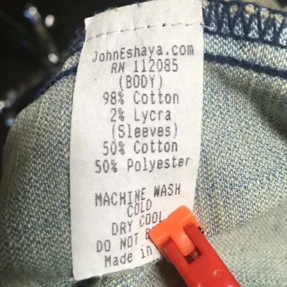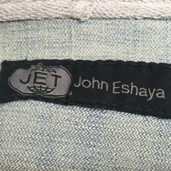 John Eshaya Size P/S Blue Denim Gray Knit Hood Jacket 2400-203-51320John Eshaya makes casual dressing easy with this urban cool distressed denim jacket with knit sleeves and hood. Perfect for the first chill of Fall or of nighttime.Size P/SAcross the chest - 19 1/2 inchesAcross the waist - 17 inchesShoulder to hem - 19 inchesShoulder to end of sleeve - 23 inchesShoulder to shoulder - 16 inchesMade in the USAFabric = DenimItem ID: 10230Category: JacketSKU: 3289-10230